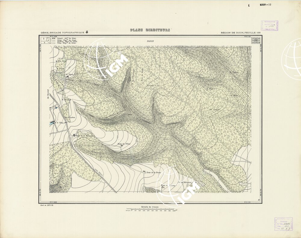Paris. – Service Géographique de l'Arme 1914-1918. – Questi piani sono stati allestiti durante la guerra mondiale da i "Groupes de Canevas de Tir aux Armées". Su di essi venivano riportate le sistemazioni difensive amiche e nemiche e le varie opere militari. Nelle regioni in cui esistevano le carte alla scala 1:10.000, provenienti da rilievi diretti, queste costituivano la base dei plans directeurs, mentre altrove essi erano dedotti dai piani catastali al 10.000 inquadrati nelle reti dei punti trigonometrici, introducendo per la rappresentazione dell'orografia le linee di livello ricavate dall'ingrandimento dei rilevamenti alla scala 1:40.000. Poichè con tale sistema non si aveva una esatta rappresentazione del terreno, a cura dei "Groupes de Canevas de Tir" fu provveduto, in molte zone, all'esecuzione dei rilievi regolari alla scala 1:10.000. Di tali piani esistono diverse edizioni con formato variabile: una edizione in nero con orografia rappresentata a curve di livello all'equidistanza di m.5 con quadrettatura chilometrica-sistema Lambert; altre edizioni: in nero con curve di livello in bistro, e policrome, sono senza quadrettatura.
