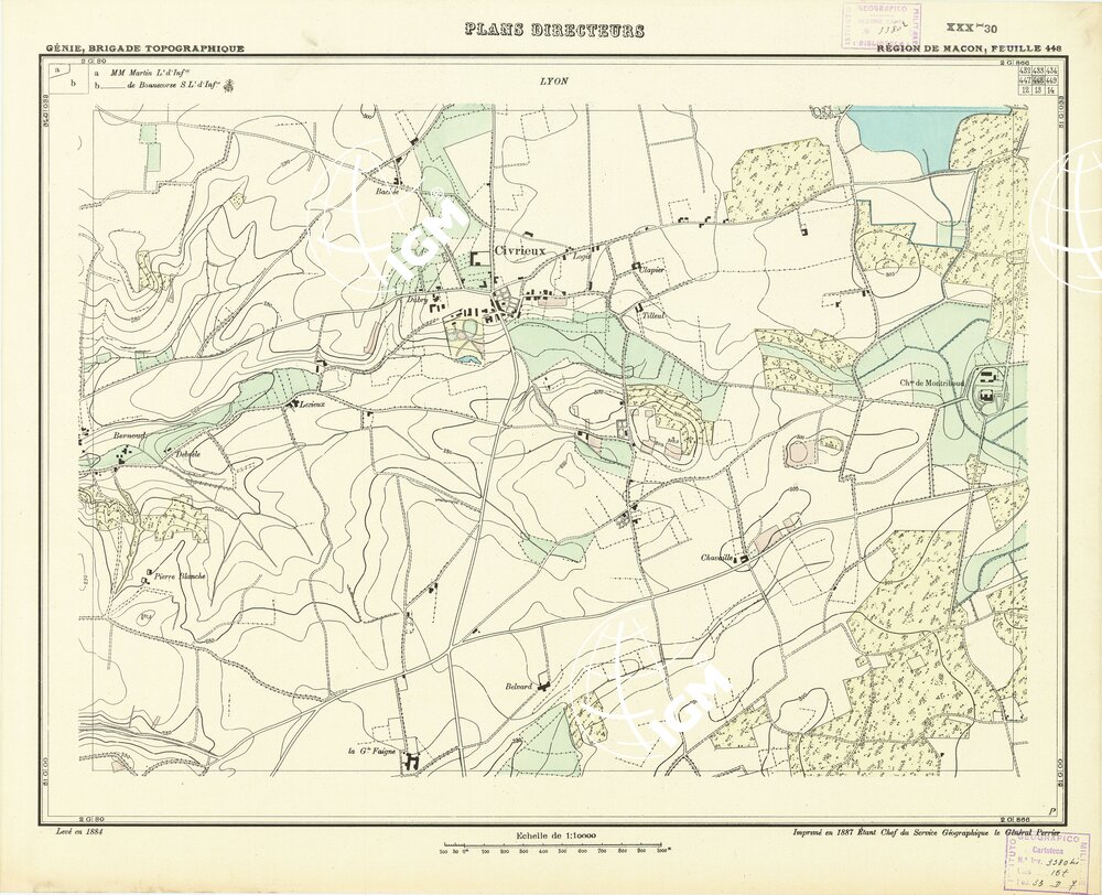 Paris. – Service Géographique de l'Arme 1914-1918. – Questi piani sono stati allestiti durante la guerra mondiale da i "Groupes de Canevas de Tir aux Armées". Su di essi venivano riportate le sistemazioni difensive amiche e nemiche e le varie opere militari. Nelle regioni in cui esistevano le carte alla scala 1:10.000, provenienti da rilievi diretti, queste costituivano la base dei plans directeurs, mentre altrove essi erano dedotti dai piani catastali al 10.000 inquadrati nelle reti dei punti trigonometrici, introducendo per la rappresentazione dell'orografia le linee di livello ricavate dall'ingrandimento dei rilevamenti alla scala 1:40.000. Poichè con tale sistema non si aveva una esatta rappresentazione del terreno, a cura dei "Groupes de Canevas de Tir" fu provveduto, in molte zone, all'esecuzione dei rilievi regolari alla scala 1:10.000. Di tali piani esistono diverse edizioni con formato variabile: una edizione in nero con orografia rappresentata a curve di livello all'equidistanza di m.5 con quadrettatura chilometrica-sistema Lambert; altre edizioni: in nero con curve di livello in bistro, e policrome, sono senza quadrettatura.
