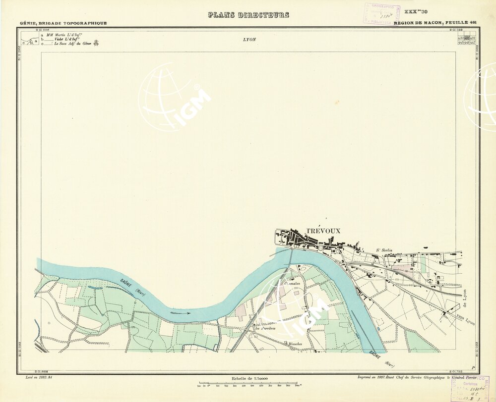 Paris. – Service Géographique de l'Arme 1914-1918. – Questi piani sono stati allestiti durante la guerra mondiale da i "Groupes de Canevas de Tir aux Armées". Su di essi venivano riportate le sistemazioni difensive amiche e nemiche e le varie opere militari. Nelle regioni in cui esistevano le carte alla scala 1:10.000, provenienti da rilievi diretti, queste costituivano la base dei plans directeurs, mentre altrove essi erano dedotti dai piani catastali al 10.000 inquadrati nelle reti dei punti trigonometrici, introducendo per la rappresentazione dell'orografia le linee di livello ricavate dall'ingrandimento dei rilevamenti alla scala 1:40.000. Poichè con tale sistema non si aveva una esatta rappresentazione del terreno, a cura dei "Groupes de Canevas de Tir" fu provveduto, in molte zone, all'esecuzione dei rilievi regolari alla scala 1:10.000. Di tali piani esistono diverse edizioni con formato variabile: una edizione in nero con orografia rappresentata a curve di livello all'equidistanza di m.5 con quadrettatura chilometrica-sistema Lambert; altre edizioni: in nero con curve di livello in bistro, e policrome, sono senza quadrettatura.