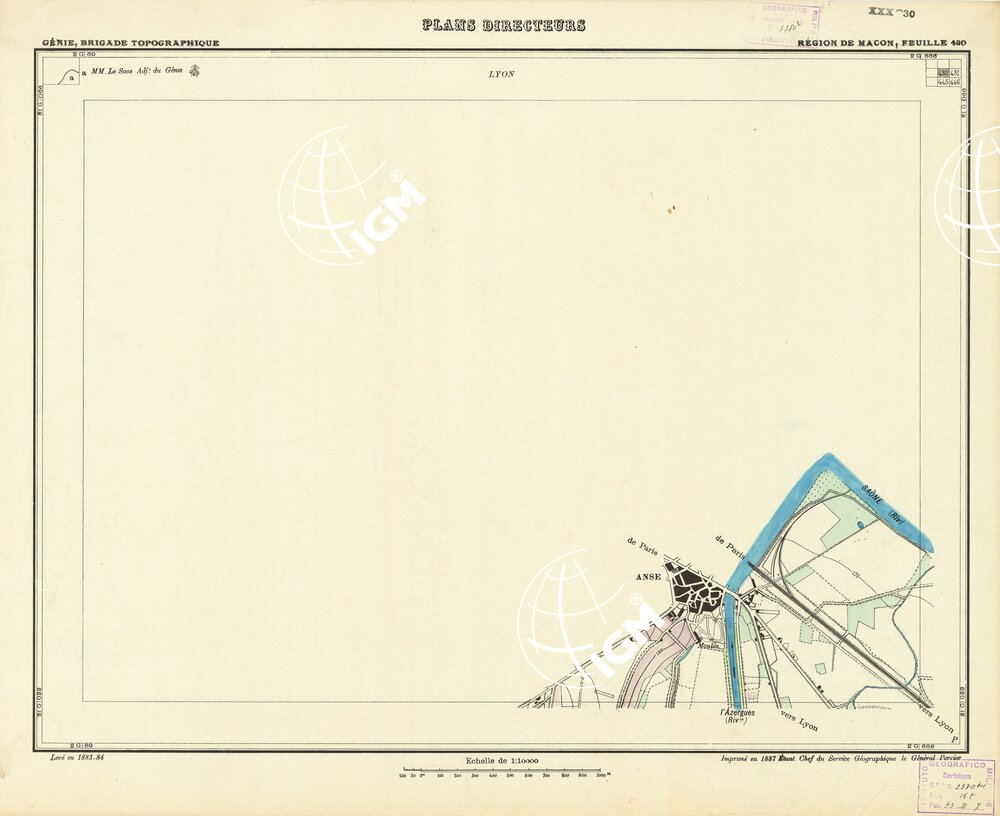 Paris. – Service Géographique de l'Arme 1914-1918. – Questi piani sono stati allestiti durante la guerra mondiale da i "Groupes de Canevas de Tir aux Armées". Su di essi venivano riportate le sistemazioni difensive amiche e nemiche e le varie opere militari. Nelle regioni in cui esistevano le carte alla scala 1:10.000, provenienti da rilievi diretti, queste costituivano la base dei plans directeurs, mentre altrove essi erano dedotti dai piani catastali al 10.000 inquadrati nelle reti dei punti trigonometrici, introducendo per la rappresentazione dell'orografia le linee di livello ricavate dall'ingrandimento dei rilevamenti alla scala 1:40.000. Poichè con tale sistema non si aveva una esatta rappresentazione del terreno, a cura dei "Groupes de Canevas de Tir" fu provveduto, in molte zone, all'esecuzione dei rilievi regolari alla scala 1:10.000. Di tali piani esistono diverse edizioni con formato variabile: una edizione in nero con orografia rappresentata a curve di livello all'equidistanza di m.5 con quadrettatura chilometrica-sistema Lambert; altre edizioni: in nero con curve di livello in bistro, e policrome, sono senza quadrettatura.