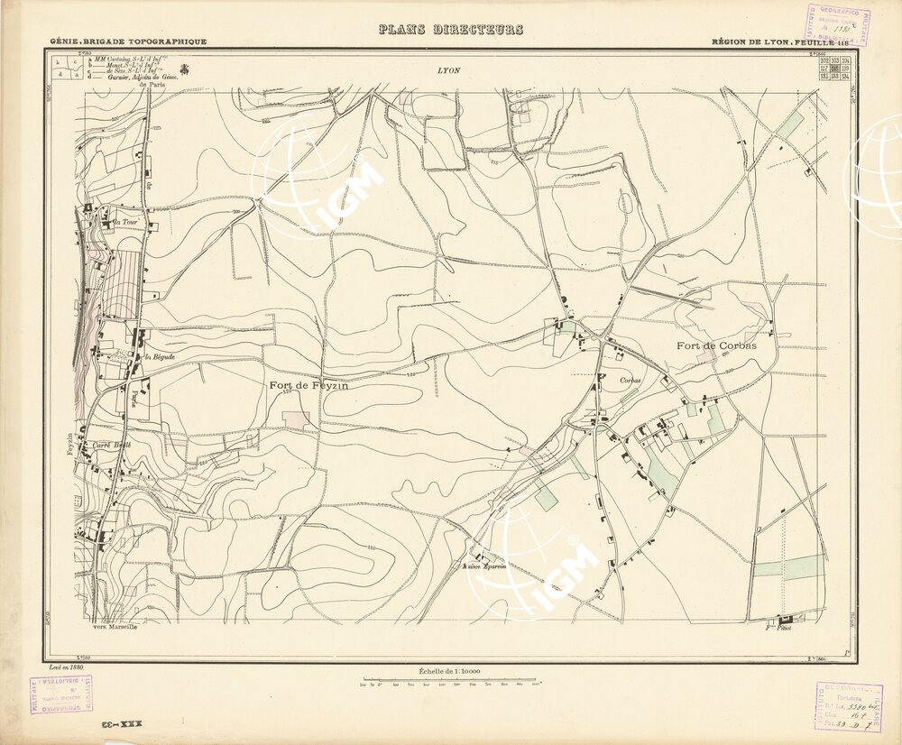 Paris. – Service Géographique de l'Arme 1914-1918. – Questi piani sono stati allestiti durante la guerra mondiale da i "Groupes de Canevas de Tir aux Armées". Su di essi venivano riportate le sistemazioni difensive amiche e nemiche e le varie opere militari. Nelle regioni in cui esistevano le carte alla scala 1:10.000, provenienti da rilievi diretti, queste costituivano la base dei plans directeurs, mentre altrove essi erano dedotti dai piani catastali al 10.000 inquadrati nelle reti dei punti trigonometrici, introducendo per la rappresentazione dell'orografia le linee di livello ricavate dall'ingrandimento dei rilevamenti alla scala 1:40.000. Poichè con tale sistema non si aveva una esatta rappresentazione del terreno, a cura dei "Groupes de Canevas de Tir" fu provveduto, in molte zone, all'esecuzione dei rilievi regolari alla scala 1:10.000. Di tali piani esistono diverse edizioni con formato variabile: una edizione in nero con orografia rappresentata a curve di livello all'equidistanza di m.5 con quadrettatura chilometrica-sistema Lambert; altre edizioni: in nero con curve di livello in bistro, e policrome, sono senza quadrettatura.