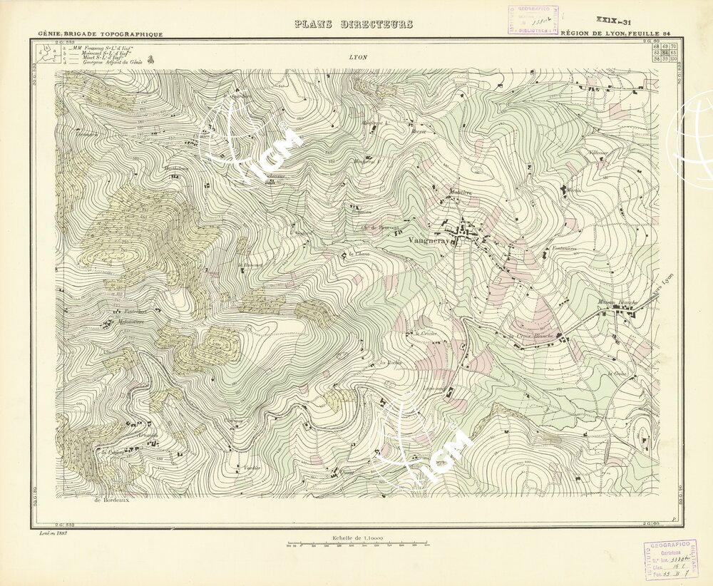 Paris. – Service Géographique de l'Arme 1914-1918. – Questi piani sono stati allestiti durante la guerra mondiale da i "Groupes de Canevas de Tir aux Armées". Su di essi venivano riportate le sistemazioni difensive amiche e nemiche e le varie opere militari. Nelle regioni in cui esistevano le carte alla scala 1:10.000, provenienti da rilievi diretti, queste costituivano la base dei plans directeurs, mentre altrove essi erano dedotti dai piani catastali al 10.000 inquadrati nelle reti dei punti trigonometrici, introducendo per la rappresentazione dell'orografia le linee di livello ricavate dall'ingrandimento dei rilevamenti alla scala 1:40.000. Poichè con tale sistema non si aveva una esatta rappresentazione del terreno, a cura dei "Groupes de Canevas de Tir" fu provveduto, in molte zone, all'esecuzione dei rilievi regolari alla scala 1:10.000. Di tali piani esistono diverse edizioni con formato variabile: una edizione in nero con orografia rappresentata a curve di livello all'equidistanza di m.5 con quadrettatura chilometrica-sistema Lambert; altre edizioni: in nero con curve di livello in bistro, e policrome, sono senza quadrettatura.