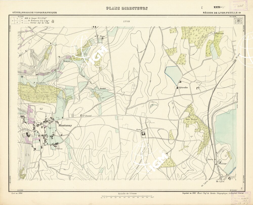 Paris. – Service Géographique de l'Arme 1914-1918. – Questi piani sono stati allestiti durante la guerra mondiale da i "Groupes de Canevas de Tir aux Armées". Su di essi venivano riportate le sistemazioni difensive amiche e nemiche e le varie opere militari. Nelle regioni in cui esistevano le carte alla scala 1:10.000, provenienti da rilievi diretti, queste costituivano la base dei plans directeurs, mentre altrove essi erano dedotti dai piani catastali al 10.000 inquadrati nelle reti dei punti trigonometrici, introducendo per la rappresentazione dell'orografia le linee di livello ricavate dall'ingrandimento dei rilevamenti alla scala 1:40.000. Poichè con tale sistema non si aveva una esatta rappresentazione del terreno, a cura dei "Groupes de Canevas de Tir" fu provveduto, in molte zone, all'esecuzione dei rilievi regolari alla scala 1:10.000. Di tali piani esistono diverse edizioni con formato variabile: una edizione in nero con orografia rappresentata a curve di livello all'equidistanza di m.5 con quadrettatura chilometrica-sistema Lambert; altre edizioni: in nero con curve di livello in bistro, e policrome, sono senza quadrettatura.