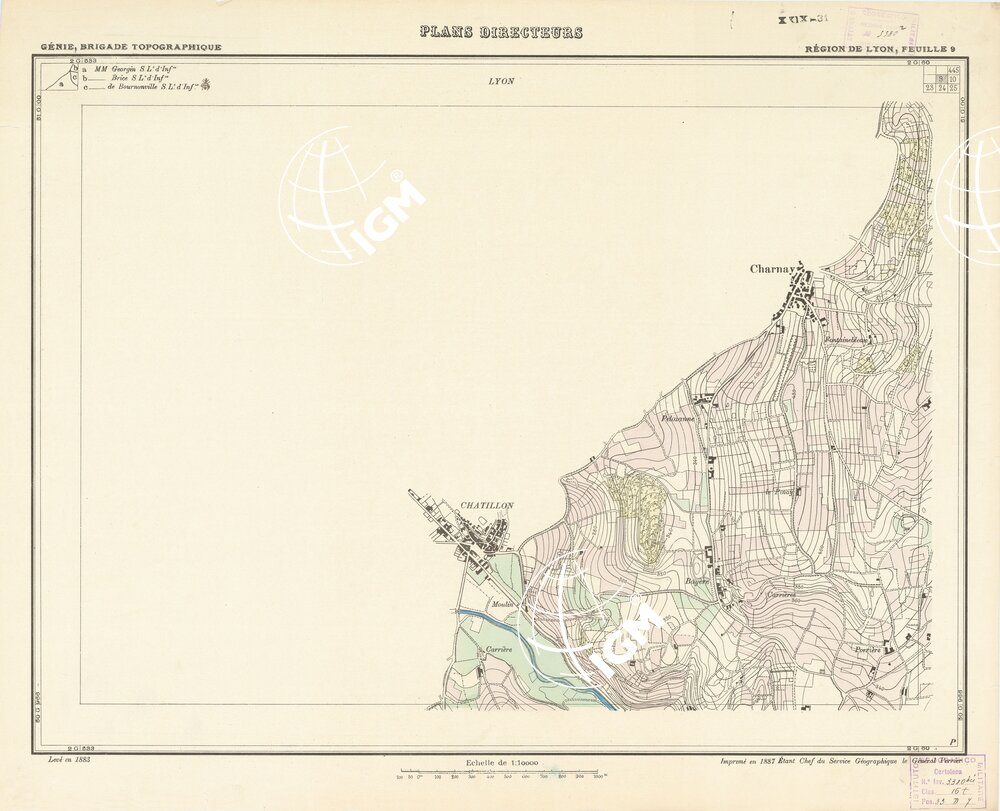 Paris. – Service Géographique de l'Arme 1914-1918. – Questi piani sono stati allestiti durante la guerra mondiale da i "Groupes de Canevas de Tir aux Armées". Su di essi venivano riportate le sistemazioni difensive amiche e nemiche e le varie opere militari. Nelle regioni in cui esistevano le carte alla scala 1:10.000, provenienti da rilievi diretti, queste costituivano la base dei plans directeurs, mentre altrove essi erano dedotti dai piani catastali al 10.000 inquadrati nelle reti dei punti trigonometrici, introducendo per la rappresentazione dell'orografia le linee di livello ricavate dall'ingrandimento dei rilevamenti alla scala 1:40.000. Poichè con tale sistema non si aveva una esatta rappresentazione del terreno, a cura dei "Groupes de Canevas de Tir" fu provveduto, in molte zone, all'esecuzione dei rilievi regolari alla scala 1:10.000. Di tali piani esistono diverse edizioni con formato variabile: una edizione in nero con orografia rappresentata a curve di livello all'equidistanza di m.5 con quadrettatura chilometrica-sistema Lambert; altre edizioni: in nero con curve di livello in bistro, e policrome, sono senza quadrettatura.