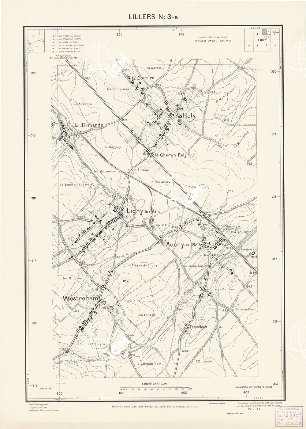 Paris. – Service Géographique de l'Arme 1914-1918. – Questi piani sono stati allestiti durante la guerra mondiale da i "Groupes de Canevas de Tir aux Armées". Su di essi venivano riportate le sistemazioni difensive amiche e nemiche e le varie opere militari. Nelle regioni in cui esistevano le carte alla scala 1:10.000, provenienti da rilievi diretti, queste costituivano la base dei plans directeurs, mentre altrove essi erano dedotti dai piani catastali al 10.000 inquadrati nelle reti dei punti trigonometrici, introducendo per la rappresentazione dell'orografia le linee di livello ricavate dall'ingrandimento dei rilevamenti alla scala 1:40.000. Poichè con tale sistema non si aveva una esatta rappresentazione del terreno, a cura dei "Groupes de Canevas de Tir" fu provveduto, in molte zone, all'esecuzione dei rilievi regolari alla scala 1:10.000. Di tali piani esistono diverse edizioni con formato variabile: una edizione in nero con orografia rappresentata a curve di livello all'equidistanza di m.5 con quadrettatura chilometrica-sistema Lambert; altre edizioni: in nero con curve di livello in bistro, e policrome, sono senza quadrettatura.