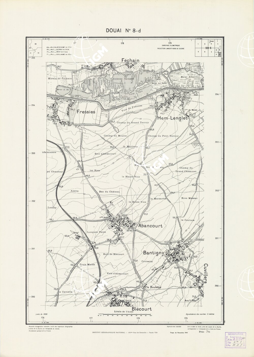 Paris. – Service Géographique de l'Arme 1914-1918. – Questi piani sono stati allestiti durante la guerra mondiale da i "Groupes de Canevas de Tir aux Armées". Su di essi venivano riportate le sistemazioni difensive amiche e nemiche e le varie opere militari. Nelle regioni in cui esistevano le carte alla scala 1:10.000, provenienti da rilievi diretti, queste costituivano la base dei plans directeurs, mentre altrove essi erano dedotti dai piani catastali al 10.000 inquadrati nelle reti dei punti trigonometrici, introducendo per la rappresentazione dell'orografia le linee di livello ricavate dall'ingrandimento dei rilevamenti alla scala 1:40.000. Poichè con tale sistema non si aveva una esatta rappresentazione del terreno, a cura dei "Groupes de Canevas de Tir" fu provveduto, in molte zone, all'esecuzione dei rilievi regolari alla scala 1:10.000. Di tali piani esistono diverse edizioni con formato variabile: una edizione in nero con orografia rappresentata a curve di livello all'equidistanza di m.5 con quadrettatura chilometrica-sistema Lambert; altre edizioni: in nero con curve di livello in bistro, e policrome, sono senza quadrettatura.