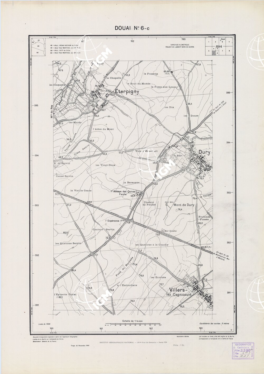 Paris. – Service Géographique de l'Arme 1914-1918. – Questi piani sono stati allestiti durante la guerra mondiale da i "Groupes de Canevas de Tir aux Armées". Su di essi venivano riportate le sistemazioni difensive amiche e nemiche e le varie opere militari. Nelle regioni in cui esistevano le carte alla scala 1:10.000, provenienti da rilievi diretti, queste costituivano la base dei plans directeurs, mentre altrove essi erano dedotti dai piani catastali al 10.000 inquadrati nelle reti dei punti trigonometrici, introducendo per la rappresentazione dell'orografia le linee di livello ricavate dall'ingrandimento dei rilevamenti alla scala 1:40.000. Poichè con tale sistema non si aveva una esatta rappresentazione del terreno, a cura dei "Groupes de Canevas de Tir" fu provveduto, in molte zone, all'esecuzione dei rilievi regolari alla scala 1:10.000. Di tali piani esistono diverse edizioni con formato variabile: una edizione in nero con orografia rappresentata a curve di livello all'equidistanza di m.5 con quadrettatura chilometrica-sistema Lambert; altre edizioni: in nero con curve di livello in bistro, e policrome, sono senza quadrettatura.
