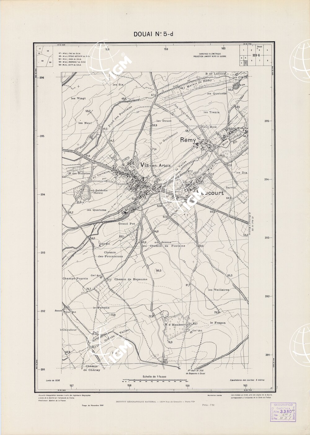 Paris. – Service Géographique de l'Arme 1914-1918. – Questi piani sono stati allestiti durante la guerra mondiale da i "Groupes de Canevas de Tir aux Armées". Su di essi venivano riportate le sistemazioni difensive amiche e nemiche e le varie opere militari. Nelle regioni in cui esistevano le carte alla scala 1:10.000, provenienti da rilievi diretti, queste costituivano la base dei plans directeurs, mentre altrove essi erano dedotti dai piani catastali al 10.000 inquadrati nelle reti dei punti trigonometrici, introducendo per la rappresentazione dell'orografia le linee di livello ricavate dall'ingrandimento dei rilevamenti alla scala 1:40.000. Poichè con tale sistema non si aveva una esatta rappresentazione del terreno, a cura dei "Groupes de Canevas de Tir" fu provveduto, in molte zone, all'esecuzione dei rilievi regolari alla scala 1:10.000. Di tali piani esistono diverse edizioni con formato variabile: una edizione in nero con orografia rappresentata a curve di livello all'equidistanza di m.5 con quadrettatura chilometrica-sistema Lambert; altre edizioni: in nero con curve di livello in bistro, e policrome, sono senza quadrettatura.