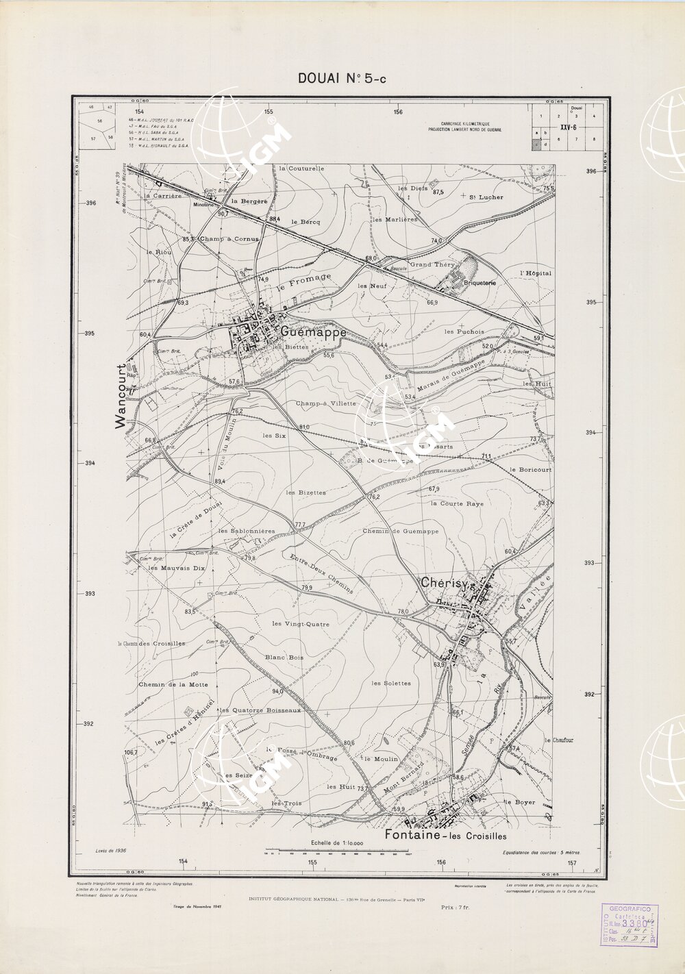 Paris. – Service Géographique de l'Arme 1914-1918. – Questi piani sono stati allestiti durante la guerra mondiale da i "Groupes de Canevas de Tir aux Armées". Su di essi venivano riportate le sistemazioni difensive amiche e nemiche e le varie opere militari. Nelle regioni in cui esistevano le carte alla scala 1:10.000, provenienti da rilievi diretti, queste costituivano la base dei plans directeurs, mentre altrove essi erano dedotti dai piani catastali al 10.000 inquadrati nelle reti dei punti trigonometrici, introducendo per la rappresentazione dell'orografia le linee di livello ricavate dall'ingrandimento dei rilevamenti alla scala 1:40.000. Poichè con tale sistema non si aveva una esatta rappresentazione del terreno, a cura dei "Groupes de Canevas de Tir" fu provveduto, in molte zone, all'esecuzione dei rilievi regolari alla scala 1:10.000. Di tali piani esistono diverse edizioni con formato variabile: una edizione in nero con orografia rappresentata a curve di livello all'equidistanza di m.5 con quadrettatura chilometrica-sistema Lambert; altre edizioni: in nero con curve di livello in bistro, e policrome, sono senza quadrettatura.