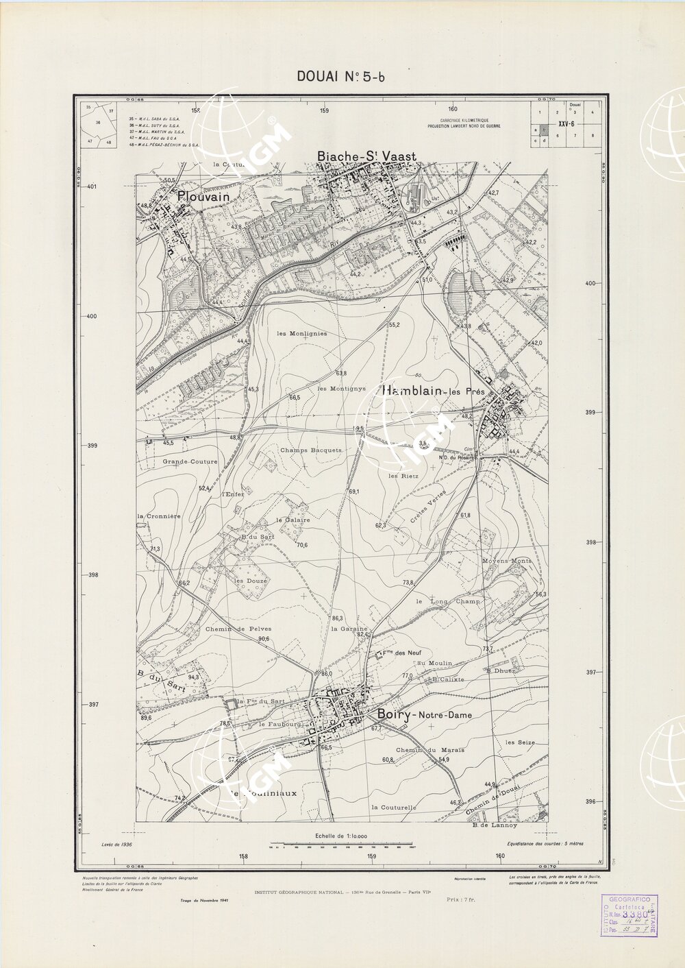 Paris. – Service Géographique de l'Arme 1914-1918. – Questi piani sono stati allestiti durante la guerra mondiale da i "Groupes de Canevas de Tir aux Armées". Su di essi venivano riportate le sistemazioni difensive amiche e nemiche e le varie opere militari. Nelle regioni in cui esistevano le carte alla scala 1:10.000, provenienti da rilievi diretti, queste costituivano la base dei plans directeurs, mentre altrove essi erano dedotti dai piani catastali al 10.000 inquadrati nelle reti dei punti trigonometrici, introducendo per la rappresentazione dell'orografia le linee di livello ricavate dall'ingrandimento dei rilevamenti alla scala 1:40.000. Poichè con tale sistema non si aveva una esatta rappresentazione del terreno, a cura dei "Groupes de Canevas de Tir" fu provveduto, in molte zone, all'esecuzione dei rilievi regolari alla scala 1:10.000. Di tali piani esistono diverse edizioni con formato variabile: una edizione in nero con orografia rappresentata a curve di livello all'equidistanza di m.5 con quadrettatura chilometrica-sistema Lambert; altre edizioni: in nero con curve di livello in bistro, e policrome, sono senza quadrettatura.