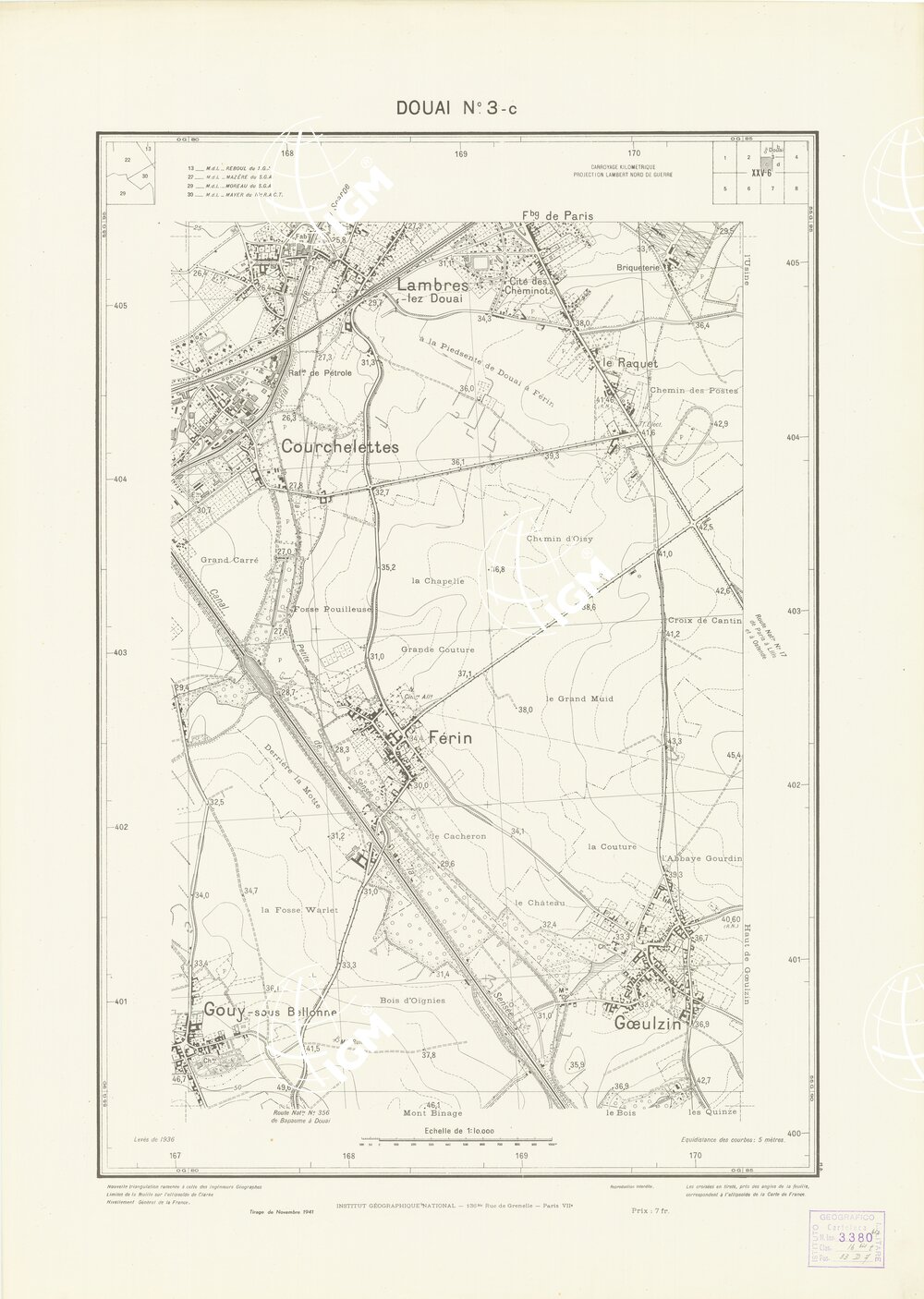 Paris. – Service Géographique de l'Arme 1914-1918. – Questi piani sono stati allestiti durante la guerra mondiale da i "Groupes de Canevas de Tir aux Armées". Su di essi venivano riportate le sistemazioni difensive amiche e nemiche e le varie opere militari. Nelle regioni in cui esistevano le carte alla scala 1:10.000, provenienti da rilievi diretti, queste costituivano la base dei plans directeurs, mentre altrove essi erano dedotti dai piani catastali al 10.000 inquadrati nelle reti dei punti trigonometrici, introducendo per la rappresentazione dell'orografia le linee di livello ricavate dall'ingrandimento dei rilevamenti alla scala 1:40.000. Poichè con tale sistema non si aveva una esatta rappresentazione del terreno, a cura dei "Groupes de Canevas de Tir" fu provveduto, in molte zone, all'esecuzione dei rilievi regolari alla scala 1:10.000. Di tali piani esistono diverse edizioni con formato variabile: una edizione in nero con orografia rappresentata a curve di livello all'equidistanza di m.5 con quadrettatura chilometrica-sistema Lambert; altre edizioni: in nero con curve di livello in bistro, e policrome, sono senza quadrettatura.