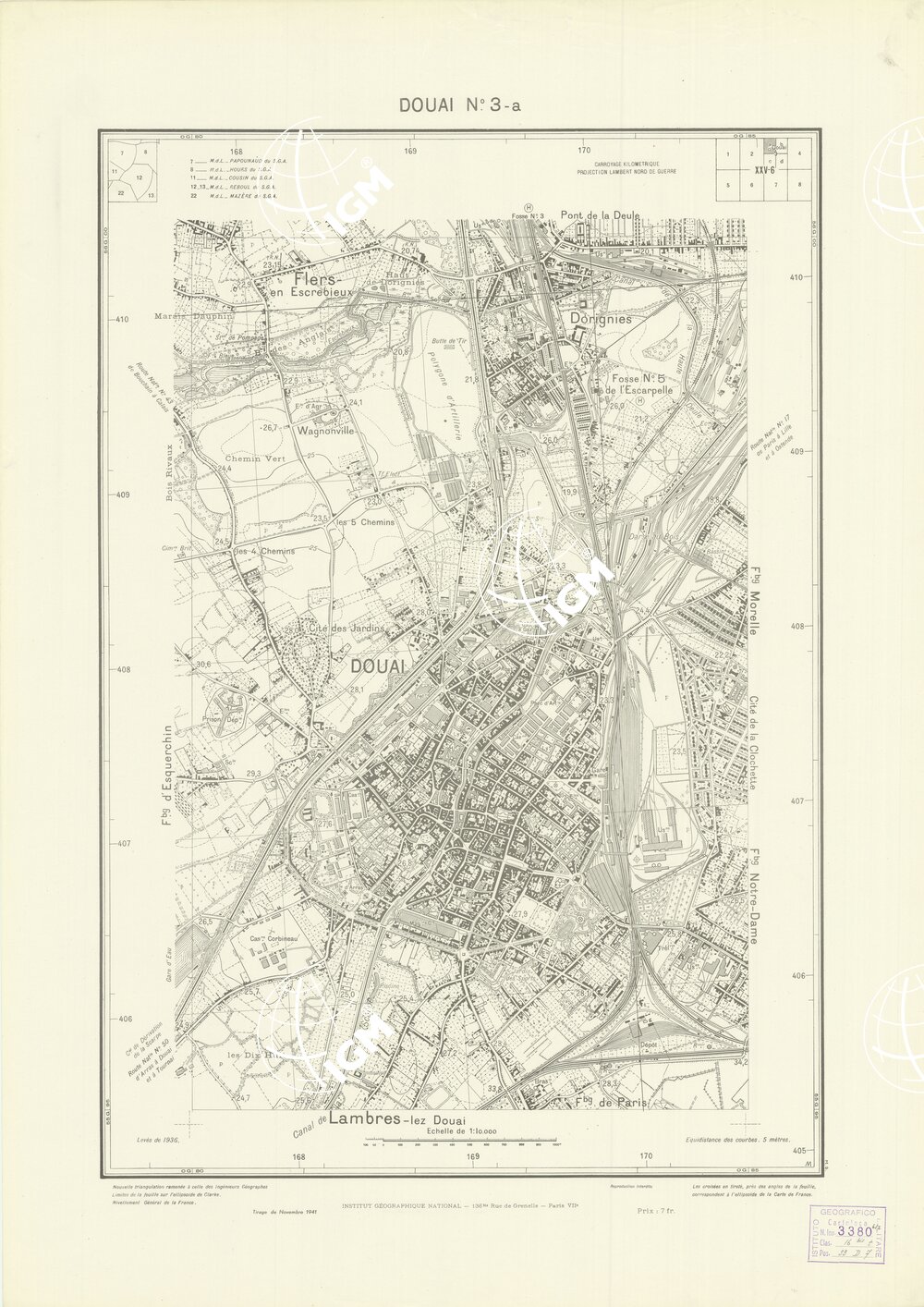Paris. – Service Géographique de l'Arme 1914-1918. – Questi piani sono stati allestiti durante la guerra mondiale da i "Groupes de Canevas de Tir aux Armées". Su di essi venivano riportate le sistemazioni difensive amiche e nemiche e le varie opere militari. Nelle regioni in cui esistevano le carte alla scala 1:10.000, provenienti da rilievi diretti, queste costituivano la base dei plans directeurs, mentre altrove essi erano dedotti dai piani catastali al 10.000 inquadrati nelle reti dei punti trigonometrici, introducendo per la rappresentazione dell'orografia le linee di livello ricavate dall'ingrandimento dei rilevamenti alla scala 1:40.000. Poichè con tale sistema non si aveva una esatta rappresentazione del terreno, a cura dei "Groupes de Canevas de Tir" fu provveduto, in molte zone, all'esecuzione dei rilievi regolari alla scala 1:10.000. Di tali piani esistono diverse edizioni con formato variabile: una edizione in nero con orografia rappresentata a curve di livello all'equidistanza di m.5 con quadrettatura chilometrica-sistema Lambert; altre edizioni: in nero con curve di livello in bistro, e policrome, sono senza quadrettatura.