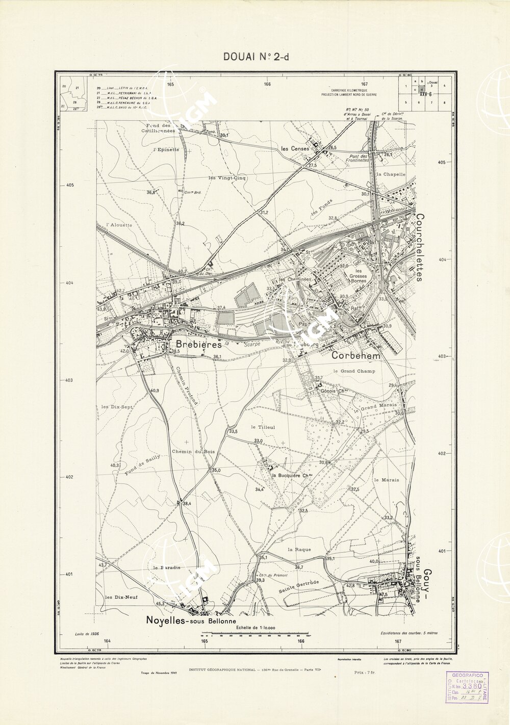 Paris. – Service Géographique de l'Arme 1914-1918. – Questi piani sono stati allestiti durante la guerra mondiale da i "Groupes de Canevas de Tir aux Armées". Su di essi venivano riportate le sistemazioni difensive amiche e nemiche e le varie opere militari. Nelle regioni in cui esistevano le carte alla scala 1:10.000, provenienti da rilievi diretti, queste costituivano la base dei plans directeurs, mentre altrove essi erano dedotti dai piani catastali al 10.000 inquadrati nelle reti dei punti trigonometrici, introducendo per la rappresentazione dell'orografia le linee di livello ricavate dall'ingrandimento dei rilevamenti alla scala 1:40.000. Poichè con tale sistema non si aveva una esatta rappresentazione del terreno, a cura dei "Groupes de Canevas de Tir" fu provveduto, in molte zone, all'esecuzione dei rilievi regolari alla scala 1:10.000. Di tali piani esistono diverse edizioni con formato variabile: una edizione in nero con orografia rappresentata a curve di livello all'equidistanza di m.5 con quadrettatura chilometrica-sistema Lambert; altre edizioni: in nero con curve di livello in bistro, e policrome, sono senza quadrettatura.