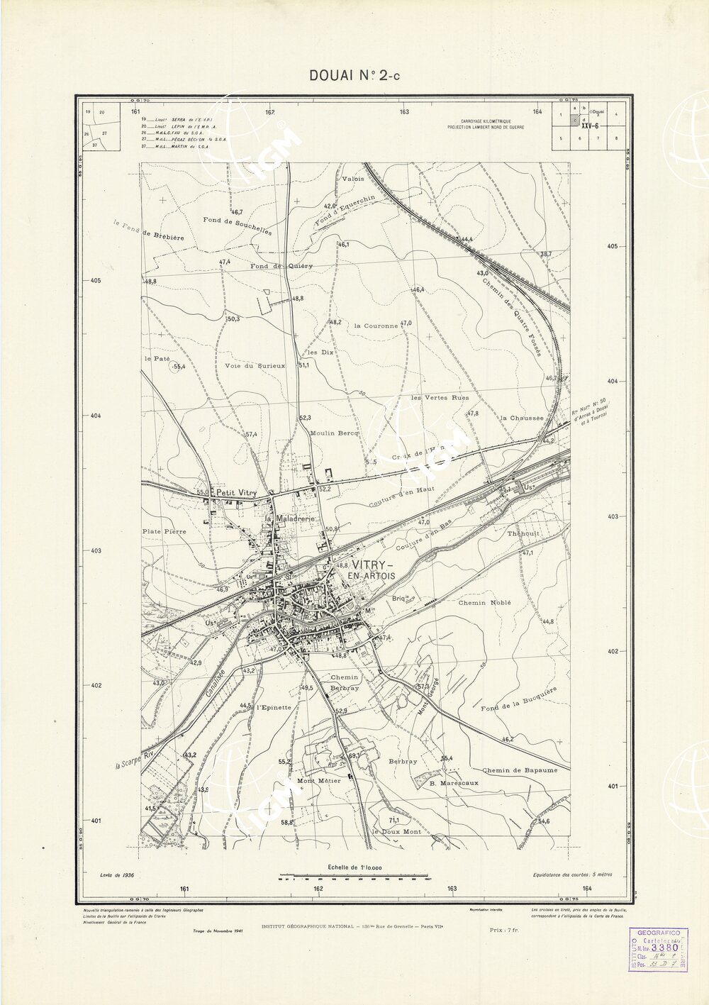 Paris. – Service Géographique de l'Arme 1914-1918. – Questi piani sono stati allestiti durante la guerra mondiale da i "Groupes de Canevas de Tir aux Armées". Su di essi venivano riportate le sistemazioni difensive amiche e nemiche e le varie opere militari. Nelle regioni in cui esistevano le carte alla scala 1:10.000, provenienti da rilievi diretti, queste costituivano la base dei plans directeurs, mentre altrove essi erano dedotti dai piani catastali al 10.000 inquadrati nelle reti dei punti trigonometrici, introducendo per la rappresentazione dell'orografia le linee di livello ricavate dall'ingrandimento dei rilevamenti alla scala 1:40.000. Poichè con tale sistema non si aveva una esatta rappresentazione del terreno, a cura dei "Groupes de Canevas de Tir" fu provveduto, in molte zone, all'esecuzione dei rilievi regolari alla scala 1:10.000. Di tali piani esistono diverse edizioni con formato variabile: una edizione in nero con orografia rappresentata a curve di livello all'equidistanza di m.5 con quadrettatura chilometrica-sistema Lambert; altre edizioni: in nero con curve di livello in bistro, e policrome, sono senza quadrettatura.