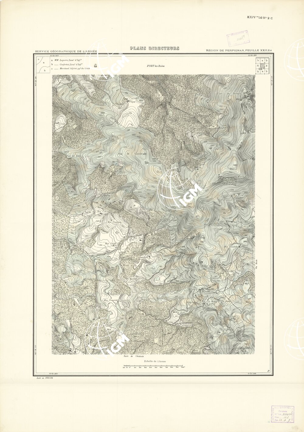 Paris. – Service Géographique de l'Arme 1914-1918. – Questi piani sono stati allestiti durante la guerra mondiale da i "Groupes de Canevas de Tir aux Armées". Su di essi venivano riportate le sistemazioni difensive amiche e nemiche e le varie opere militari. Nelle regioni in cui esistevano le carte alla scala 1:10.000, provenienti da rilievi diretti, queste costituivano la base dei plans directeurs, mentre altrove essi erano dedotti dai piani catastali al 10.000 inquadrati nelle reti dei punti trigonometrici, introducendo per la rappresentazione dell'orografia le linee di livello ricavate dall'ingrandimento dei rilevamenti alla scala 1:40.000. Poichè con tale sistema non si aveva una esatta rappresentazione del terreno, a cura dei "Groupes de Canevas de Tir" fu provveduto, in molte zone, all'esecuzione dei rilievi regolari alla scala 1:10.000. Di tali piani esistono diverse edizioni con formato variabile: una edizione in nero con orografia rappresentata a curve di livello all'equidistanza di m.5 con quadrettatura chilometrica-sistema Lambert; altre edizioni: in nero con curve di livello in bistro, e policrome, sono senza quadrettatura.