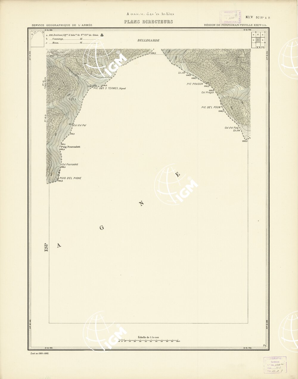 Paris. – Service Géographique de l'Arme 1914-1918. – Questi piani sono stati allestiti durante la guerra mondiale da i "Groupes de Canevas de Tir aux Armées". Su di essi venivano riportate le sistemazioni difensive amiche e nemiche e le varie opere militari. Nelle regioni in cui esistevano le carte alla scala 1:10.000, provenienti da rilievi diretti, queste costituivano la base dei plans directeurs, mentre altrove essi erano dedotti dai piani catastali al 10.000 inquadrati nelle reti dei punti trigonometrici, introducendo per la rappresentazione dell'orografia le linee di livello ricavate dall'ingrandimento dei rilevamenti alla scala 1:40.000. Poichè con tale sistema non si aveva una esatta rappresentazione del terreno, a cura dei "Groupes de Canevas de Tir" fu provveduto, in molte zone, all'esecuzione dei rilievi regolari alla scala 1:10.000. Di tali piani esistono diverse edizioni con formato variabile: una edizione in nero con orografia rappresentata a curve di livello all'equidistanza di m.5 con quadrettatura chilometrica-sistema Lambert; altre edizioni: in nero con curve di livello in bistro, e policrome, sono senza quadrettatura.