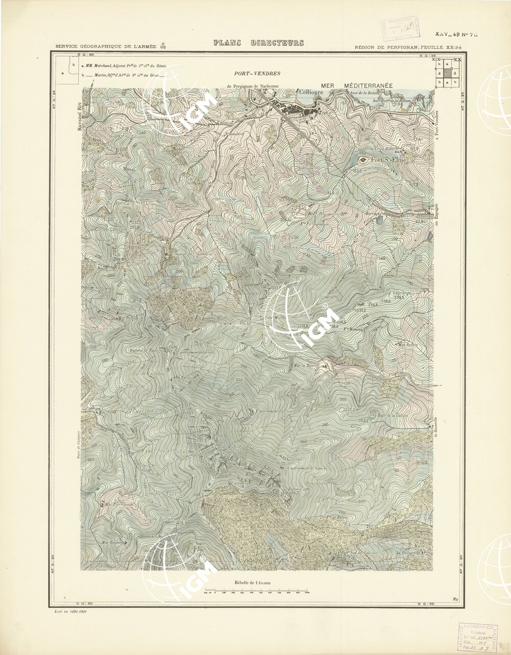 Paris. – Service Géographique de l'Arme 1914-1918. – Questi piani sono stati allestiti durante la guerra mondiale da i "Groupes de Canevas de Tir aux Armées". Su di essi venivano riportate le sistemazioni difensive amiche e nemiche e le varie opere militari. Nelle regioni in cui esistevano le carte alla scala 1:10.000, provenienti da rilievi diretti, queste costituivano la base dei plans directeurs, mentre altrove essi erano dedotti dai piani catastali al 10.000 inquadrati nelle reti dei punti trigonometrici, introducendo per la rappresentazione dell'orografia le linee di livello ricavate dall'ingrandimento dei rilevamenti alla scala 1:40.000. Poichè con tale sistema non si aveva una esatta rappresentazione del terreno, a cura dei "Groupes de Canevas de Tir" fu provveduto, in molte zone, all'esecuzione dei rilievi regolari alla scala 1:10.000. Di tali piani esistono diverse edizioni con formato variabile: una edizione in nero con orografia rappresentata a curve di livello all'equidistanza di m.5 con quadrettatura chilometrica-sistema Lambert; altre edizioni: in nero con curve di livello in bistro, e policrome, sono senza quadrettatura.