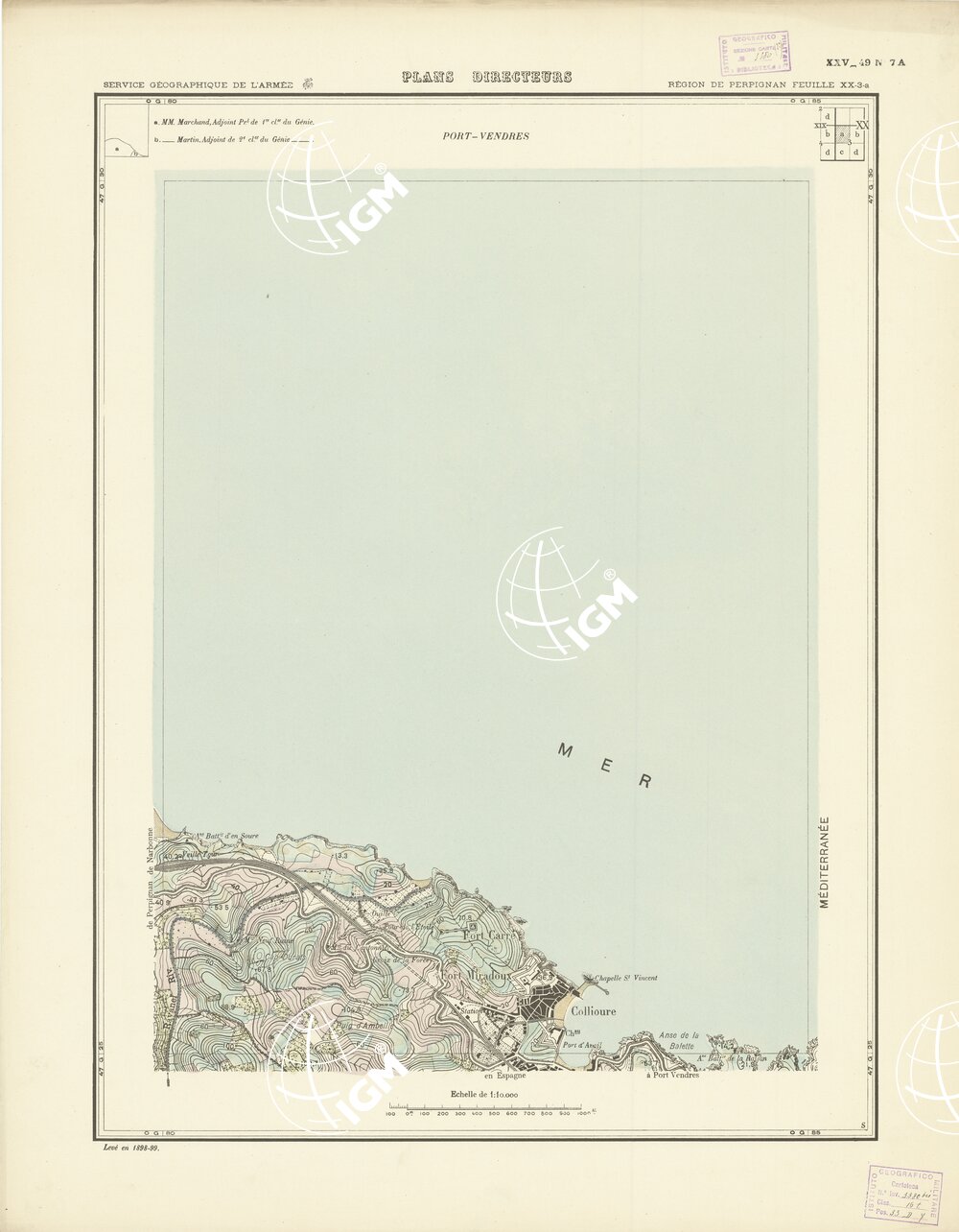 Paris. – Service Géographique de l'Arme 1914-1918. – Questi piani sono stati allestiti durante la guerra mondiale da i "Groupes de Canevas de Tir aux Armées". Su di essi venivano riportate le sistemazioni difensive amiche e nemiche e le varie opere militari. Nelle regioni in cui esistevano le carte alla scala 1:10.000, provenienti da rilievi diretti, queste costituivano la base dei plans directeurs, mentre altrove essi erano dedotti dai piani catastali al 10.000 inquadrati nelle reti dei punti trigonometrici, introducendo per la rappresentazione dell'orografia le linee di livello ricavate dall'ingrandimento dei rilevamenti alla scala 1:40.000. Poichè con tale sistema non si aveva una esatta rappresentazione del terreno, a cura dei "Groupes de Canevas de Tir" fu provveduto, in molte zone, all'esecuzione dei rilievi regolari alla scala 1:10.000. Di tali piani esistono diverse edizioni con formato variabile: una edizione in nero con orografia rappresentata a curve di livello all'equidistanza di m.5 con quadrettatura chilometrica-sistema Lambert; altre edizioni: in nero con curve di livello in bistro, e policrome, sono senza quadrettatura.