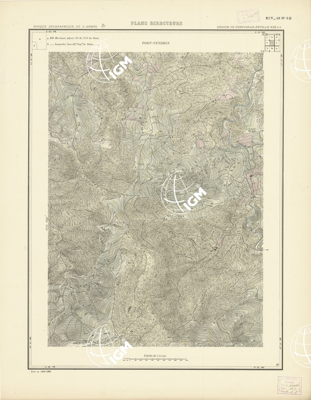 Paris. – Service Géographique de l'Arme 1914-1918. – Questi piani sono stati allestiti durante la guerra mondiale da i "Groupes de Canevas de Tir aux Armées". Su di essi venivano riportate le sistemazioni difensive amiche e nemiche e le varie opere militari. Nelle regioni in cui esistevano le carte alla scala 1:10.000, provenienti da rilievi diretti, queste costituivano la base dei plans directeurs, mentre altrove essi erano dedotti dai piani catastali al 10.000 inquadrati nelle reti dei punti trigonometrici, introducendo per la rappresentazione dell'orografia le linee di livello ricavate dall'ingrandimento dei rilevamenti alla scala 1:40.000. Poichè con tale sistema non si aveva una esatta rappresentazione del terreno, a cura dei "Groupes de Canevas de Tir" fu provveduto, in molte zone, all'esecuzione dei rilievi regolari alla scala 1:10.000. Di tali piani esistono diverse edizioni con formato variabile: una edizione in nero con orografia rappresentata a curve di livello all'equidistanza di m.5 con quadrettatura chilometrica-sistema Lambert; altre edizioni: in nero con curve di livello in bistro, e policrome, sono senza quadrettatura.