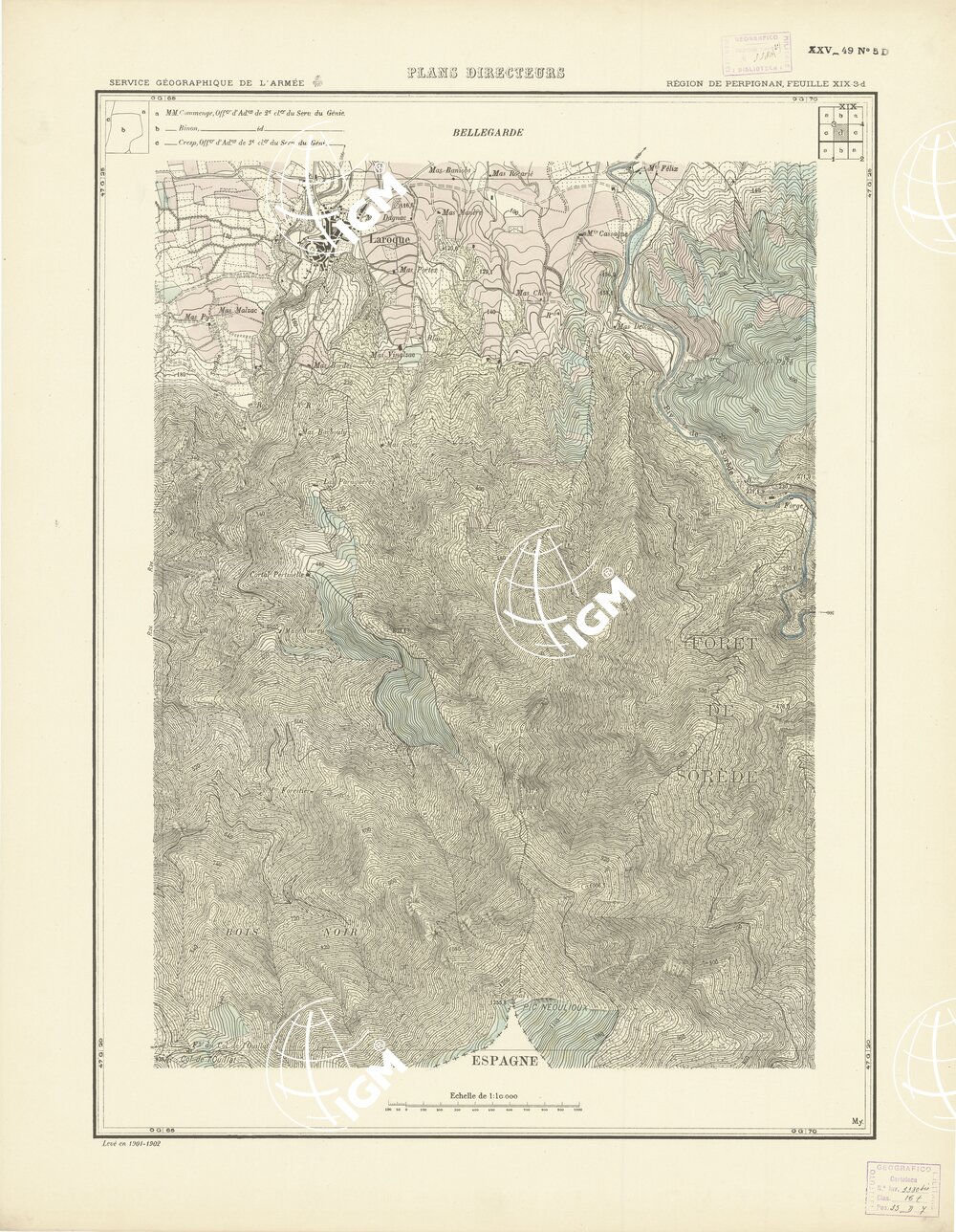 Paris. – Service Géographique de l'Arme 1914-1918. – Questi piani sono stati allestiti durante la guerra mondiale da i "Groupes de Canevas de Tir aux Armées". Su di essi venivano riportate le sistemazioni difensive amiche e nemiche e le varie opere militari. Nelle regioni in cui esistevano le carte alla scala 1:10.000, provenienti da rilievi diretti, queste costituivano la base dei plans directeurs, mentre altrove essi erano dedotti dai piani catastali al 10.000 inquadrati nelle reti dei punti trigonometrici, introducendo per la rappresentazione dell'orografia le linee di livello ricavate dall'ingrandimento dei rilevamenti alla scala 1:40.000. Poichè con tale sistema non si aveva una esatta rappresentazione del terreno, a cura dei "Groupes de Canevas de Tir" fu provveduto, in molte zone, all'esecuzione dei rilievi regolari alla scala 1:10.000. Di tali piani esistono diverse edizioni con formato variabile: una edizione in nero con orografia rappresentata a curve di livello all'equidistanza di m.5 con quadrettatura chilometrica-sistema Lambert; altre edizioni: in nero con curve di livello in bistro, e policrome, sono senza quadrettatura.