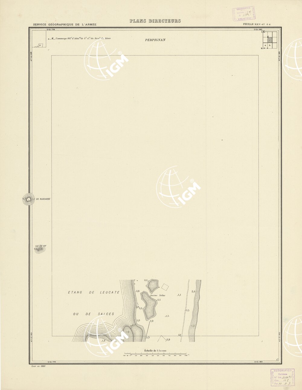 Paris. – Service Géographique de l'Arme 1914-1918. – Questi piani sono stati allestiti durante la guerra mondiale da i "Groupes de Canevas de Tir aux Armées". Su di essi venivano riportate le sistemazioni difensive amiche e nemiche e le varie opere militari. Nelle regioni in cui esistevano le carte alla scala 1:10.000, provenienti da rilievi diretti, queste costituivano la base dei plans directeurs, mentre altrove essi erano dedotti dai piani catastali al 10.000 inquadrati nelle reti dei punti trigonometrici, introducendo per la rappresentazione dell'orografia le linee di livello ricavate dall'ingrandimento dei rilevamenti alla scala 1:40.000. Poichè con tale sistema non si aveva una esatta rappresentazione del terreno, a cura dei "Groupes de Canevas de Tir" fu provveduto, in molte zone, all'esecuzione dei rilievi regolari alla scala 1:10.000. Di tali piani esistono diverse edizioni con formato variabile: una edizione in nero con orografia rappresentata a curve di livello all'equidistanza di m.5 con quadrettatura chilometrica-sistema Lambert; altre edizioni: in nero con curve di livello in bistro, e policrome, sono senza quadrettatura.