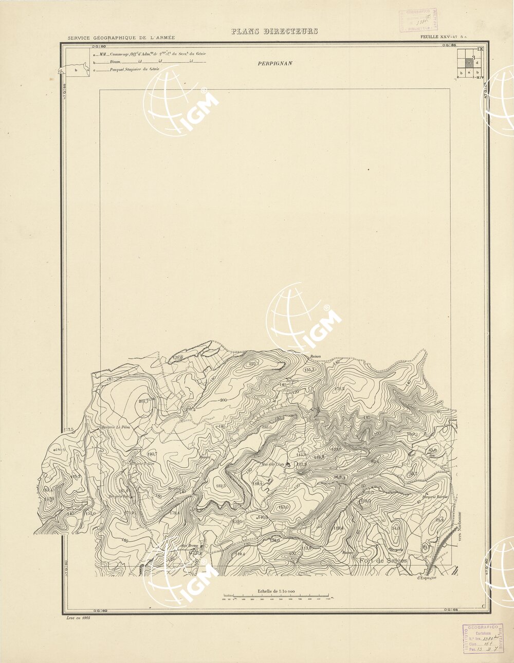 Paris. – Service Géographique de l’Arme 1914-1918. – Questi piani sono stati allestiti durante la guerra mondiale da i “Groupes de Canevas de Tir aux Armées”. Su di essi venivano riportate le sistemazioni difensive amiche e nemiche e le varie opere militari. Nelle regioni in cui esistevano le carte alla scala 1:10.000, provenienti da rilievi diretti, queste costituivano la base dei plans directeurs, mentre altrove essi erano dedotti dai piani catastali al 10.000 inquadrati nelle reti dei puntio trigonometrici, introducendo per la rappresentazione dell’orografia le linee di livello ricavate dall’ingrandimento dei rilevamenti alla scala 1:40.000. Poichè con tale sistema non si aveva una esatta rappresentazione del terreno, a cura dei “Groupes de Canevas de Tir” fu provveduto, in molte zone, all’esecuzione dei rilievi regolari alla scala 1:10.000. Di tali piani esistono diverse edizioni con formato variabile: una edizione in nero con orografia rappresentata a curve di livello all’equidistanza di m.5 con quadrettatura chilometrica-sistema Lambert; altre edizioni: in nero con curve di livello in bistro, e policrome, sono senza quadrettatura.