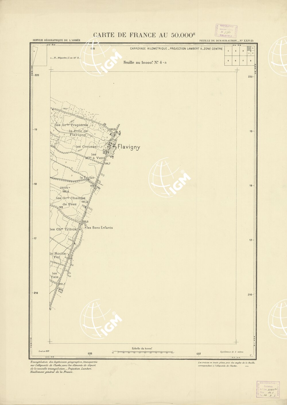 Paris. – Service Géographique de l'Arme 1914-1918. – Questi piani sono stati allestiti durante la guerra mondiale da i "Groupes de Canevas de Tir aux Armées". Su di essi venivano riportate le sistemazioni difensive amiche e nemiche e le varie opere militari. Nelle regioni in cui esistevano le carte alla scala 1:10.000, provenienti da rilievi diretti, queste costituivano la base dei plans directeurs, mentre altrove essi erano dedotti dai piani catastali al 10.000 inquadrati nelle reti dei puntio trigonometrici, introducendo per la rappresentazione dell'orografia le linee di livello ricavate dall'ingrandimento dei rilevamenti alla scala 1:40.000. Poichè con tale sistema non si aveva una esatta rappresentazione del terreno, a cura dei "Groupes de Canevas de Tir" fu provveduto, in molte zone, all'esecuzione dei rilievi regolari alla scala 1:10.000. Di tali piani esistono diverse edizioni con formato variabile: una edizione in nero con orografia rappresentata a curve di livello all'equidistanza di m.5 con quadrettatura chilometrica-sistema Lambert; altre edizioni: in nero con curve di livello in bistro, e policrome, sono senza quadrettatura.