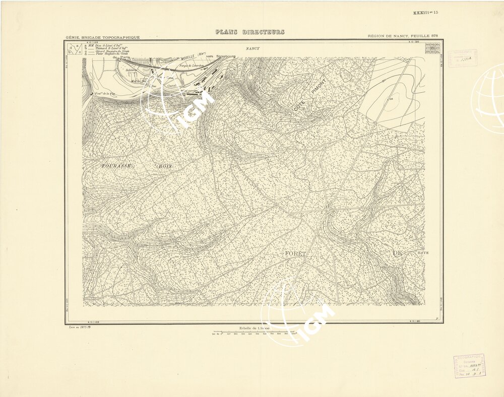 Paris. – Service Géographique de l'Arme 1914-1918. – Questi piani sono stati allestiti durante la guerra mondiale da i "Groupes de Canevas de Tir aux Armées". Su di essi venivano riportate le sistemazioni difensive amiche e nemiche e le varie opere militari. Nelle regioni in cui esistevano le carte alla scala 1:10.000, provenienti da rilievi diretti, queste costituivano la base dei plans directeurs, mentre altrove essi erano dedotti dai piani catastali al 10.000 inquadrati nelle reti dei punti trigonometrici, introducendo per la rappresentazione dell'orografia le linee di livello ricavate dall'ingrandimento dei rilevamenti alla scala 1:40.000. Poichè con tale sistema non si aveva una esatta rappresentazione del terreno, a cura dei "Groupes de Canevas de Tir" fu provveduto, in molte zone, all'esecuzione dei rilievi regolari alla scala 1:10.000. Di tali piani esistono diverse edizioni con formato variabile: una edizione in nero con orografia rappresentata a curve di livello all'equidistanza di m.5 con quadrettatura chilometrica-sistema Lambert; altre edizioni: in nero con curve di livello in bistro, e policrome, sono senza quadrettatura.
