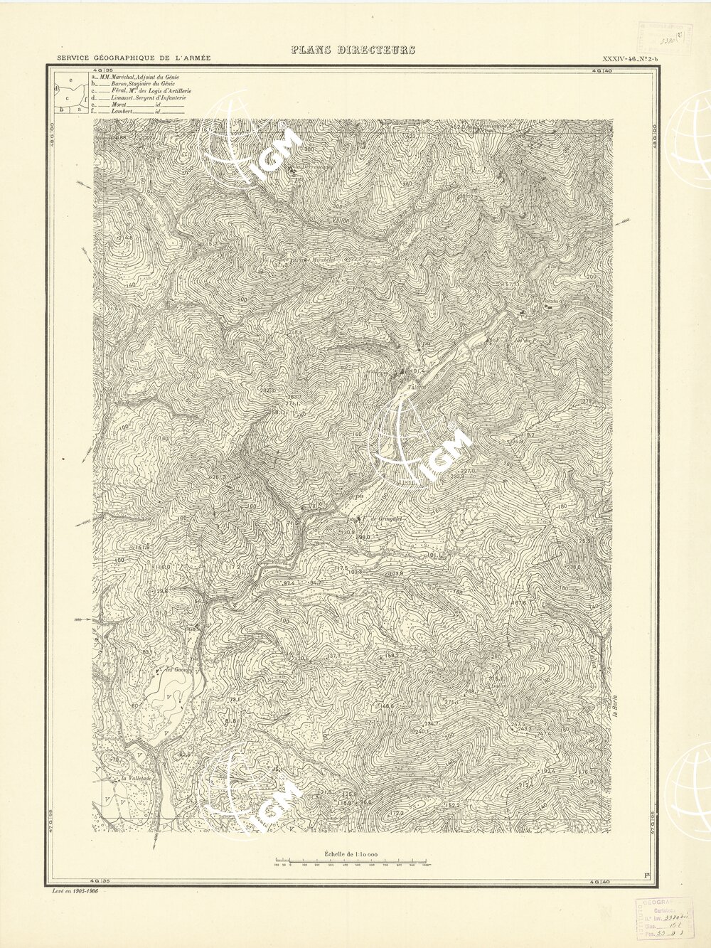 Paris. – Service Géographique de l'Arme 1914-1918. – Questi piani sono stati allestiti durante la guerra mondiale da i "Groupes de Canevas de Tir aux Armées". Su di essi venivano riportate le sistemazioni difensive amiche e nemiche e le varie opere militari. Nelle regioni in cui esistevano le carte alla scala 1:10.000, provenienti da rilievi diretti, queste costituivano la base dei plans directeurs, mentre altrove essi erano dedotti dai piani catastali al 10.000 inquadrati nelle reti dei punti trigonometrici, introducendo per la rappresentazione dell'orografia le linee di livello ricavate dall'ingrandimento dei rilevamenti alla scala 1:40.000. Poichè con tale sistema non si aveva una esatta rappresentazione del terreno, a cura dei "Groupes de Canevas de Tir" fu provveduto, in molte zone, all'esecuzione dei rilievi regolari alla scala 1:10.000. Di tali piani esistono diverse edizioni con formato variabile: una edizione in nero con orografia rappresentata a curve di livello all'equidistanza di m.5 con quadrettatura chilometrica-sistema Lambert; altre edizioni: in nero con curve di livello in bistro, e policrome, sono senza quadrettatura.