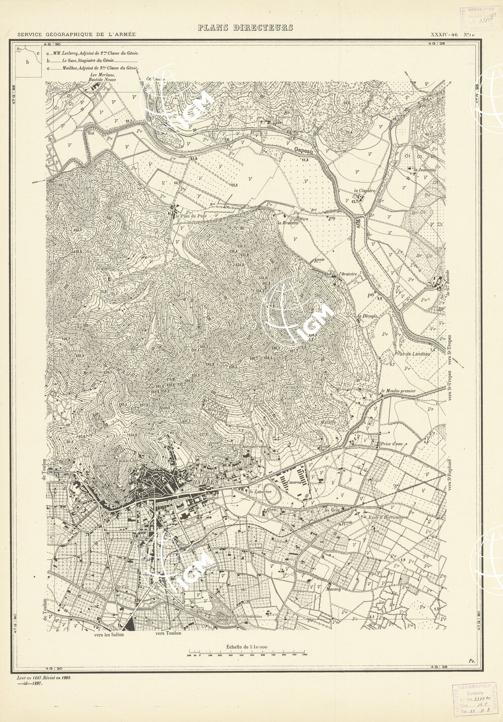 Paris. – Service Géographique de l'Arme 1914-1918. – Questi piani sono stati allestiti durante la guerra mondiale da i "Groupes de Canevas de Tir aux Armées". Su di essi venivano riportate le sistemazioni difensive amiche e nemiche e le varie opere militari. Nelle regioni in cui esistevano le carte alla scala 1:10.000, provenienti da rilievi diretti, queste costituivano la base dei plans directeurs, mentre altrove essi erano dedotti dai piani catastali al 10.000 inquadrati nelle reti dei punti trigonometrici, introducendo per la rappresentazione dell'orografia le linee di livello ricavate dall'ingrandimento dei rilevamenti alla scala 1:40.000. Poichè con tale sistema non si aveva una esatta rappresentazione del terreno, a cura dei "Groupes de Canevas de Tir" fu provveduto, in molte zone, all'esecuzione dei rilievi regolari alla scala 1:10.000. Di tali piani esistono diverse edizioni con formato variabile: una edizione in nero con orografia rappresentata a curve di livello all'equidistanza di m.5 con quadrettatura chilometrica-sistema Lambert; altre edizioni: in nero con curve di livello in bistro, e policrome, sono senza quadrettatura.