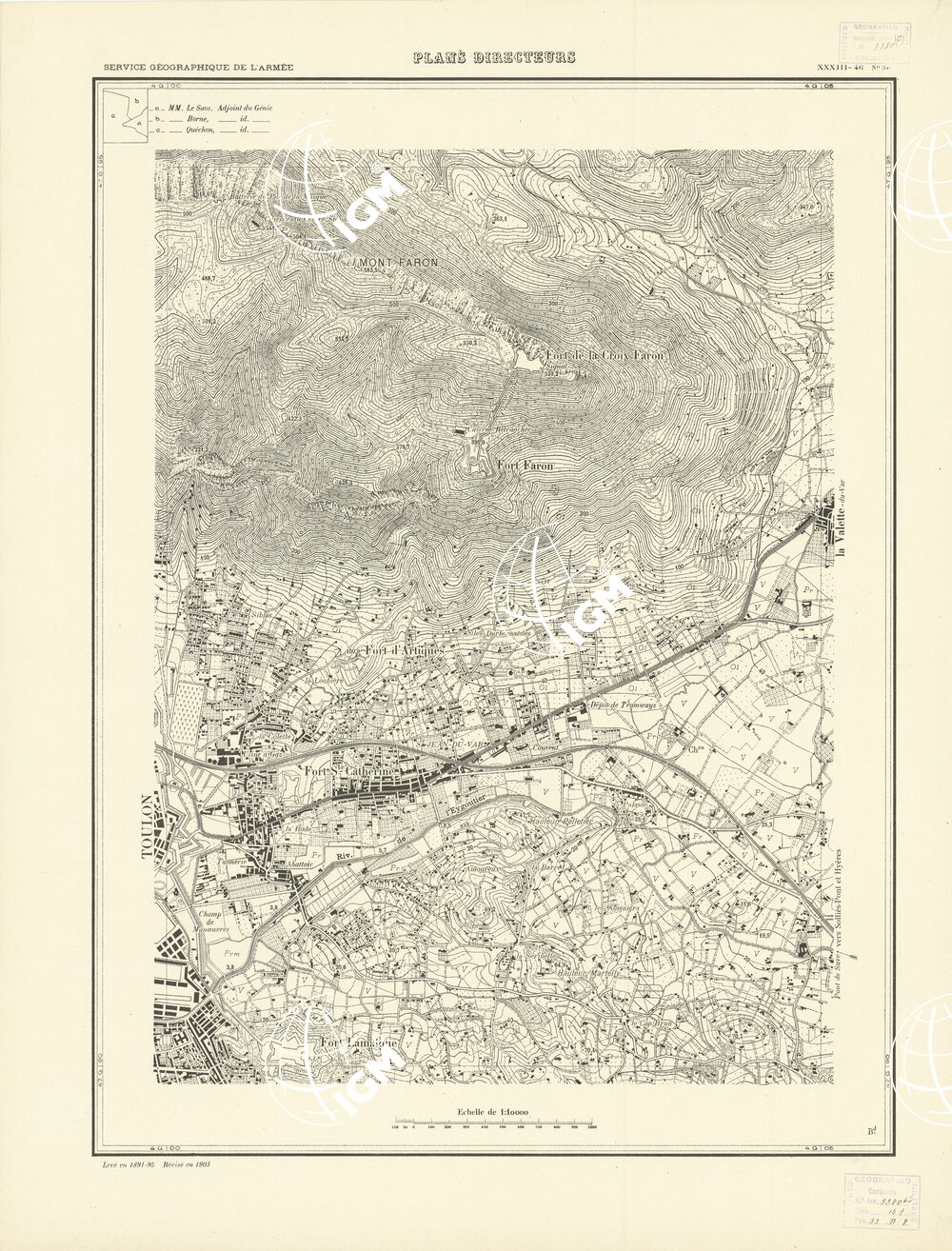 Paris. – Service Géographique de l'Arme 1914-1918. – Questi piani sono stati allestiti durante la guerra mondiale da i "Groupes de Canevas de Tir aux Armées". Su di essi venivano riportate le sistemazioni difensive amiche e nemiche e le varie opere militari. Nelle regioni in cui esistevano le carte alla scala 1:10.000, provenienti da rilievi diretti, queste costituivano la base dei plans directeurs, mentre altrove essi erano dedotti dai piani catastali al 10.000 inquadrati nelle reti dei punti trigonometrici, introducendo per la rappresentazione dell'orografia le linee di livello ricavate dall'ingrandimento dei rilevamenti alla scala 1:40.000. Poichè con tale sistema non si aveva una esatta rappresentazione del terreno, a cura dei "Groupes de Canevas de Tir" fu provveduto, in molte zone, all'esecuzione dei rilievi regolari alla scala 1:10.000. Di tali piani esistono diverse edizioni con formato variabile: una edizione in nero con orografia rappresentata a curve di livello all'equidistanza di m.5 con quadrettatura chilometrica-sistema Lambert; altre edizioni: in nero con curve di livello in bistro, e policrome, sono senza quadrettatura.