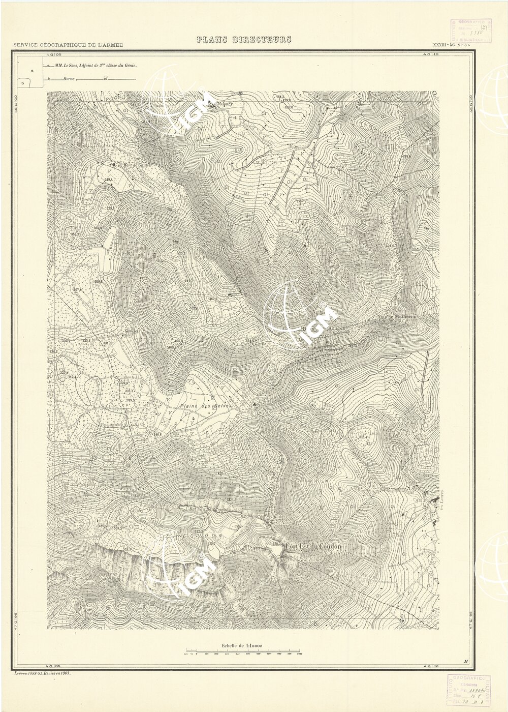 Paris. – Service Géographique de l'Arme 1914-1918. – Questi piani sono stati allestiti durante la guerra mondiale da i "Groupes de Canevas de Tir aux Armées". Su di essi venivano riportate le sistemazioni difensive amiche e nemiche e le varie opere militari. Nelle regioni in cui esistevano le carte alla scala 1:10.000, provenienti da rilievi diretti, queste costituivano la base dei plans directeurs, mentre altrove essi erano dedotti dai piani catastali al 10.000 inquadrati nelle reti dei punti trigonometrici, introducendo per la rappresentazione dell'orografia le linee di livello ricavate dall'ingrandimento dei rilevamenti alla scala 1:40.000. Poichè con tale sistema non si aveva una esatta rappresentazione del terreno, a cura dei "Groupes de Canevas de Tir" fu provveduto, in molte zone, all'esecuzione dei rilievi regolari alla scala 1:10.000. Di tali piani esistono diverse edizioni con formato variabile: una edizione in nero con orografia rappresentata a curve di livello all'equidistanza di m.5 con quadrettatura chilometrica-sistema Lambert; altre edizioni: in nero con curve di livello in bistro, e policrome, sono senza quadrettatura.