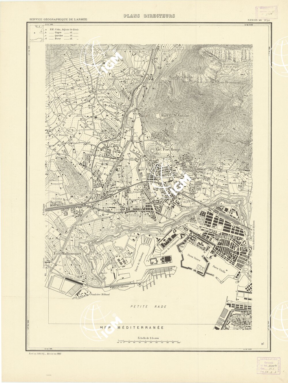 Paris. – Service Géographique de l'Arme 1914-1918. – Questi piani sono stati allestiti durante la guerra mondiale da i "Groupes de Canevas de Tir aux Armées". Su di essi venivano riportate le sistemazioni difensive amiche e nemiche e le varie opere militari. Nelle regioni in cui esistevano le carte alla scala 1:10.000, provenienti da rilievi diretti, queste costituivano la base dei plans directeurs, mentre altrove essi erano dedotti dai piani catastali al 10.000 inquadrati nelle reti dei punti trigonometrici, introducendo per la rappresentazione dell'orografia le linee di livello ricavate dall'ingrandimento dei rilevamenti alla scala 1:40.000. Poichè con tale sistema non si aveva una esatta rappresentazione del terreno, a cura dei "Groupes de Canevas de Tir" fu provveduto, in molte zone, all'esecuzione dei rilievi regolari alla scala 1:10.000. Di tali piani esistono diverse edizioni con formato variabile: una edizione in nero con orografia rappresentata a curve di livello all'equidistanza di m.5 con quadrettatura chilometrica-sistema Lambert; altre edizioni: in nero con curve di livello in bistro, e policrome, sono senza quadrettatura.