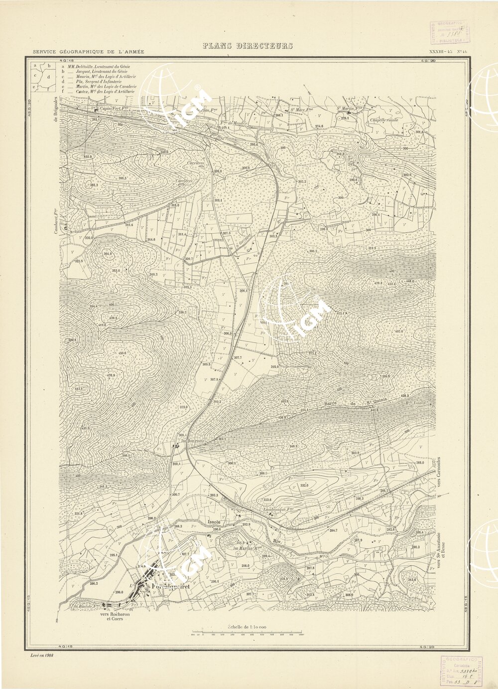 Paris. – Service Géographique de l'Arme 1914-1918. – Questi piani sono stati allestiti durante la guerra mondiale da i "Groupes de Canevas de Tir aux Armées". Su di essi venivano riportate le sistemazioni difensive amiche e nemiche e le varie opere militari. Nelle regioni in cui esistevano le carte alla scala 1:10.000, provenienti da rilievi diretti, queste costituivano la base dei plans directeurs, mentre altrove essi erano dedotti dai piani catastali al 10.000 inquadrati nelle reti dei punti trigonometrici, introducendo per la rappresentazione dell'orografia le linee di livello ricavate dall'ingrandimento dei rilevamenti alla scala 1:40.000. Poichè con tale sistema non si aveva una esatta rappresentazione del terreno, a cura dei "Groupes de Canevas de Tir" fu provveduto, in molte zone, all'esecuzione dei rilievi regolari alla scala 1:10.000. Di tali piani esistono diverse edizioni con formato variabile: una edizione in nero con orografia rappresentata a curve di livello all'equidistanza di m.5 con quadrettatura chilometrica-sistema Lambert; altre edizioni: in nero con curve di livello in bistro, e policrome, sono senza quadrettatura.