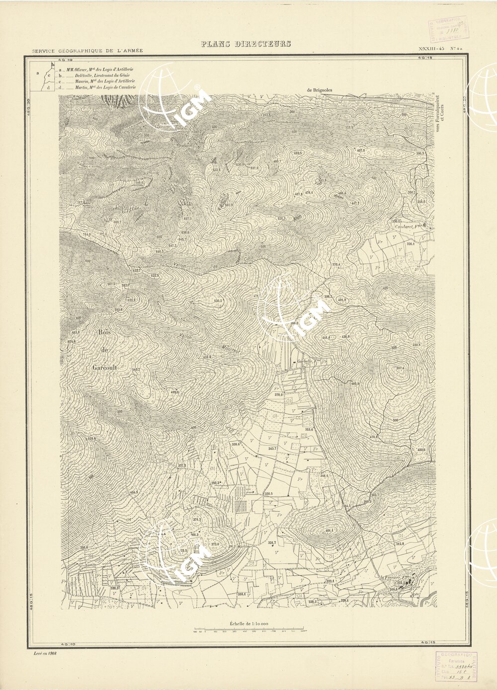 Paris. – Service Géographique de l'Arme 1914-1918. – Questi piani sono stati allestiti durante la guerra mondiale da i "Groupes de Canevas de Tir aux Armées". Su di essi venivano riportate le sistemazioni difensive amiche e nemiche e le varie opere militari. Nelle regioni in cui esistevano le carte alla scala 1:10.000, provenienti da rilievi diretti, queste costituivano la base dei plans directeurs, mentre altrove essi erano dedotti dai piani catastali al 10.000 inquadrati nelle reti dei punti trigonometrici, introducendo per la rappresentazione dell'orografia le linee di livello ricavate dall'ingrandimento dei rilevamenti alla scala 1:40.000. Poichè con tale sistema non si aveva una esatta rappresentazione del terreno, a cura dei "Groupes de Canevas de Tir" fu provveduto, in molte zone, all'esecuzione dei rilievi regolari alla scala 1:10.000. Di tali piani esistono diverse edizioni con formato variabile: una edizione in nero con orografia rappresentata a curve di livello all'equidistanza di m.5 con quadrettatura chilometrica-sistema Lambert; altre edizioni: in nero con curve di livello in bistro, e policrome, sono senza quadrettatura.