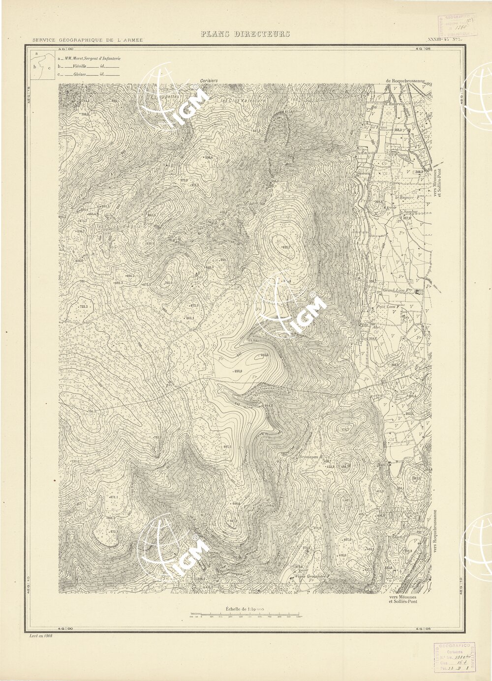 Paris. – Service Géographique de l'Arme 1914-1918. – Questi piani sono stati allestiti durante la guerra mondiale da i "Groupes de Canevas de Tir aux Armées". Su di essi venivano riportate le sistemazioni difensive amiche e nemiche e le varie opere militari. Nelle regioni in cui esistevano le carte alla scala 1:10.000, provenienti da rilievi diretti, queste costituivano la base dei plans directeurs, mentre altrove essi erano dedotti dai piani catastali al 10.000 inquadrati nelle reti dei punti trigonometrici, introducendo per la rappresentazione dell'orografia le linee di livello ricavate dall'ingrandimento dei rilevamenti alla scala 1:40.000. Poichè con tale sistema non si aveva una esatta rappresentazione del terreno, a cura dei "Groupes de Canevas de Tir" fu provveduto, in molte zone, all'esecuzione dei rilievi regolari alla scala 1:10.000. Di tali piani esistono diverse edizioni con formato variabile: una edizione in nero con orografia rappresentata a curve di livello all'equidistanza di m.5 con quadrettatura chilometrica-sistema Lambert; altre edizioni: in nero con curve di livello in bistro, e policrome, sono senza quadrettatura.