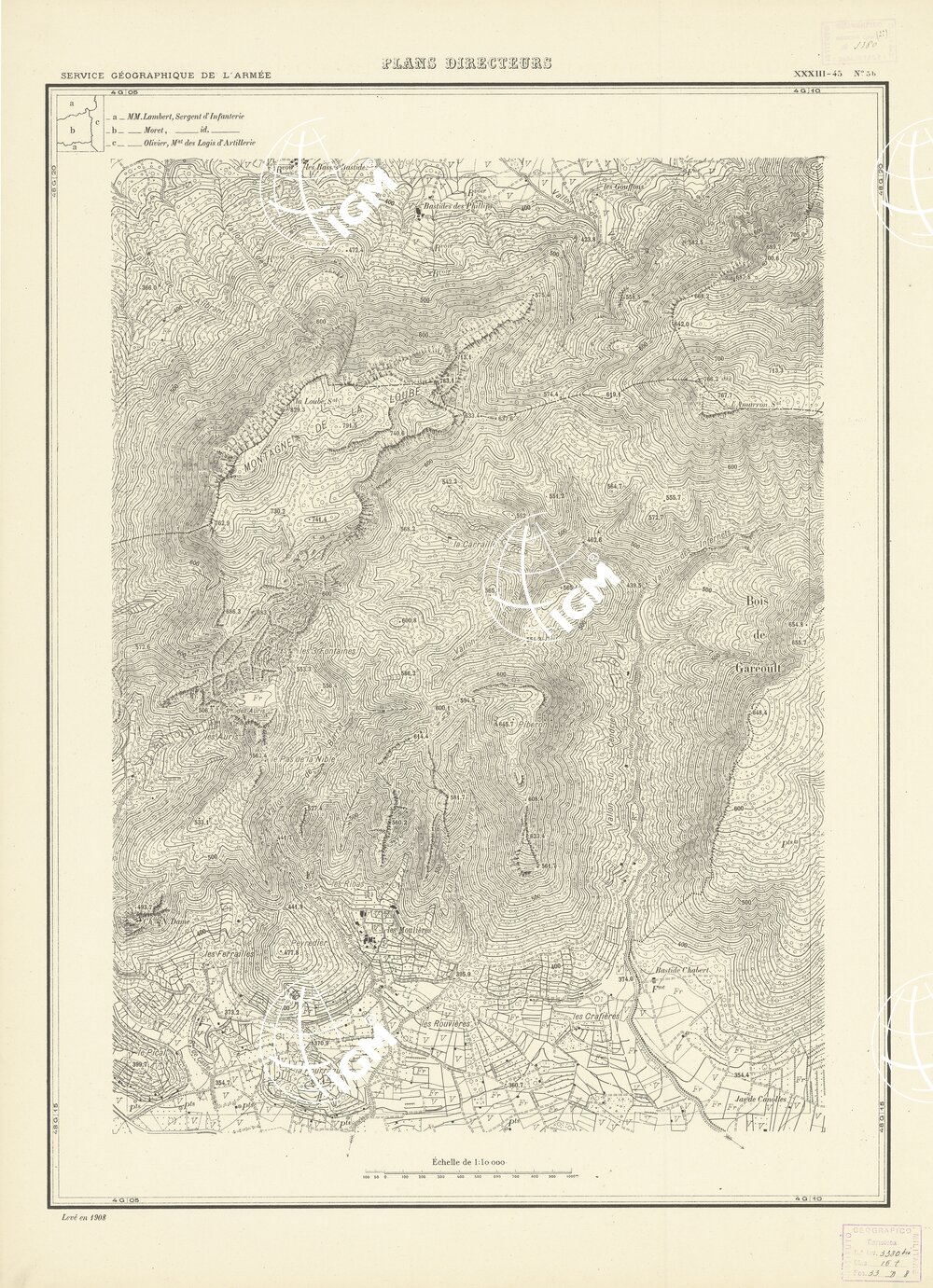 Paris. – Service Géographique de l'Arme 1914-1918. – Questi piani sono stati allestiti durante la guerra mondiale da i "Groupes de Canevas de Tir aux Armées". Su di essi venivano riportate le sistemazioni difensive amiche e nemiche e le varie opere militari. Nelle regioni in cui esistevano le carte alla scala 1:10.000, provenienti da rilievi diretti, queste costituivano la base dei plans directeurs, mentre altrove essi erano dedotti dai piani catastali al 10.000 inquadrati nelle reti dei punti trigonometrici, introducendo per la rappresentazione dell'orografia le linee di livello ricavate dall'ingrandimento dei rilevamenti alla scala 1:40.000. Poichè con tale sistema non si aveva una esatta rappresentazione del terreno, a cura dei "Groupes de Canevas de Tir" fu provveduto, in molte zone, all'esecuzione dei rilievi regolari alla scala 1:10.000. Di tali piani esistono diverse edizioni con formato variabile: una edizione in nero con orografia rappresentata a curve di livello all'equidistanza di m.5 con quadrettatura chilometrica-sistema Lambert; altre edizioni: in nero con curve di livello in bistro, e policrome, sono senza quadrettatura.