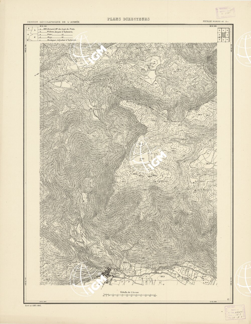 Paris. – Service Géographique de l'Arme 1914-1918. – Questi piani sono stati allestiti durante la guerra mondiale da i "Groupes de Canevas de Tir aux Armées". Su di essi venivano riportate le sistemazioni difensive amiche e nemiche e le varie opere militari. Nelle regioni in cui esistevano le carte alla scala 1:10.000, provenienti da rilievi diretti, queste costituivano la base dei plans directeurs, mentre altrove essi erano dedotti dai piani catastali al 10.000 inquadrati nelle reti dei punti trigonometrici, introducendo per la rappresentazione dell'orografia le linee di livello ricavate dall'ingrandimento dei rilevamenti alla scala 1:40.000. Poichè con tale sistema non si aveva una esatta rappresentazione del terreno, a cura dei "Groupes de Canevas de Tir" fu provveduto, in molte zone, all'esecuzione dei rilievi regolari alla scala 1:10.000. Di tali piani esistono diverse edizioni con formato variabile: una edizione in nero con orografia rappresentata a curve di livello all'equidistanza di m.5 con quadrettatura chilometrica-sistema Lambert; altre edizioni: in nero con curve di livello in bistro, e policrome, sono senza quadrettatura.