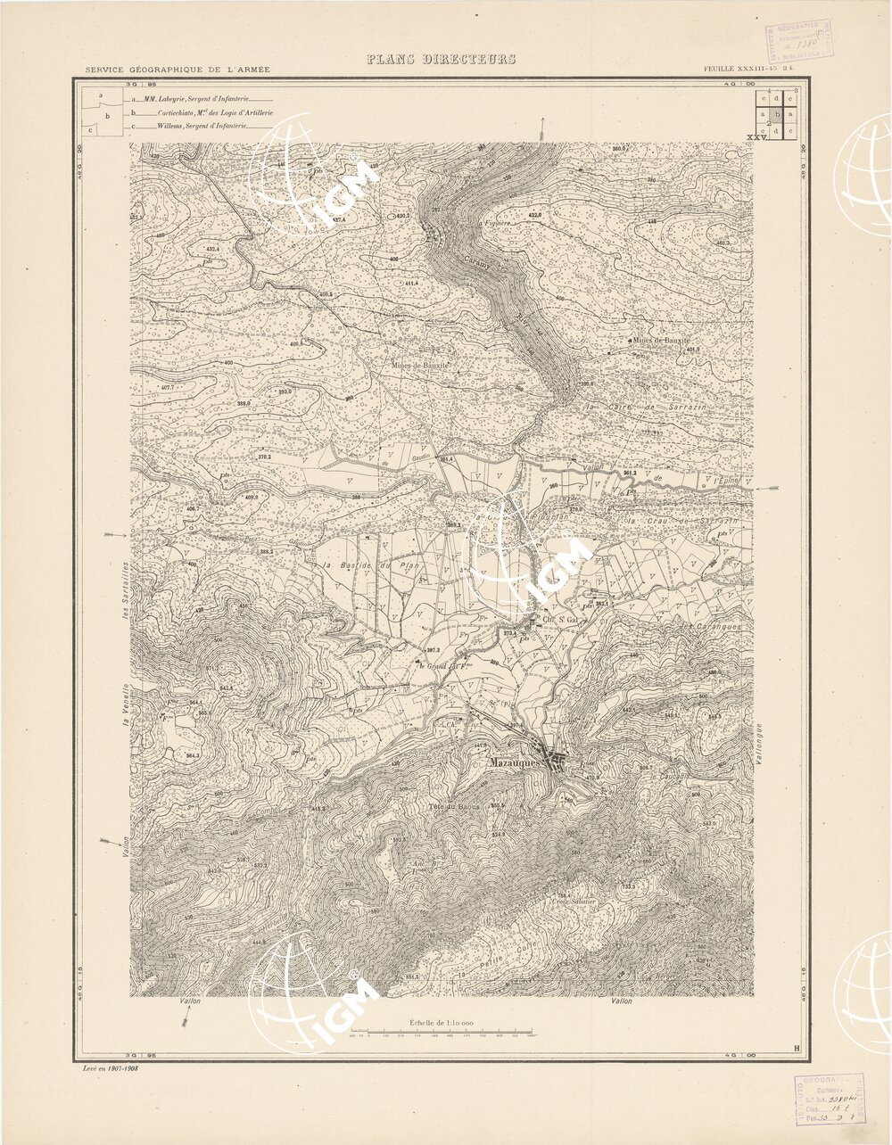 Paris. – Service Géographique de l'Arme 1914-1918. – Questi piani sono stati allestiti durante la guerra mondiale da i "Groupes de Canevas de Tir aux Armées". Su di essi venivano riportate le sistemazioni difensive amiche e nemiche e le varie opere militari. Nelle regioni in cui esistevano le carte alla scala 1:10.000, provenienti da rilievi diretti, queste costituivano la base dei plans directeurs, mentre altrove essi erano dedotti dai piani catastali al 10.000 inquadrati nelle reti dei punti trigonometrici, introducendo per la rappresentazione dell'orografia le linee di livello ricavate dall'ingrandimento dei rilevamenti alla scala 1:40.000. Poichè con tale sistema non si aveva una esatta rappresentazione del terreno, a cura dei "Groupes de Canevas de Tir" fu provveduto, in molte zone, all'esecuzione dei rilievi regolari alla scala 1:10.000. Di tali piani esistono diverse edizioni con formato variabile: una edizione in nero con orografia rappresentata a curve di livello all'equidistanza di m.5 con quadrettatura chilometrica-sistema Lambert; altre edizioni: in nero con curve di livello in bistro, e policrome, sono senza quadrettatura.