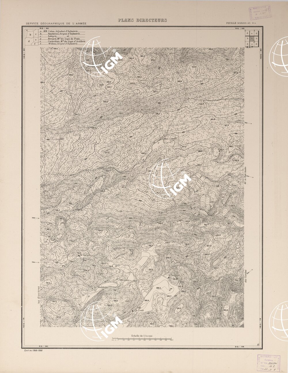 Paris. – Service Géographique de l'Arme 1914-1918. – Questi piani sono stati allestiti durante la guerra mondiale da i "Groupes de Canevas de Tir aux Armées". Su di essi venivano riportate le sistemazioni difensive amiche e nemiche e le varie opere militari. Nelle regioni in cui esistevano le carte alla scala 1:10.000, provenienti da rilievi diretti, queste costituivano la base dei plans directeurs, mentre altrove essi erano dedotti dai piani catastali al 10.000 inquadrati nelle reti dei punti trigonometrici, introducendo per la rappresentazione dell'orografia le linee di livello ricavate dall'ingrandimento dei rilevamenti alla scala 1:40.000. Poichè con tale sistema non si aveva una esatta rappresentazione del terreno, a cura dei "Groupes de Canevas de Tir" fu provveduto, in molte zone, all'esecuzione dei rilievi regolari alla scala 1:10.000. Di tali piani esistono diverse edizioni con formato variabile: una edizione in nero con orografia rappresentata a curve di livello all'equidistanza di m.5 con quadrettatura chilometrica-sistema Lambert; altre edizioni: in nero con curve di livello in bistro, e policrome, sono senza quadrettatura.