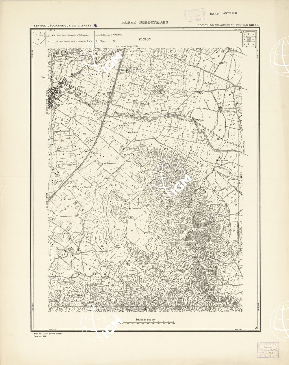 Paris. – Service Géographique de l'Arme 1914-1918. – Questi piani sono stati allestiti durante la guerra mondiale da i "Groupes de Canevas de Tir aux Armées". Su di essi venivano riportate le sistemazioni difensive amiche e nemiche e le varie opere militari. Nelle regioni in cui esistevano le carte alla scala 1:10.000, provenienti da rilievi diretti, queste costituivano la base dei plans directeurs, mentre altrove essi erano dedotti dai piani catastali al 10.000 inquadrati nelle reti dei punti trigonometrici, introducendo per la rappresentazione dell'orografia le linee di livello ricavate dall'ingrandimento dei rilevamenti alla scala 1:40.000. Poichè con tale sistema non si aveva una esatta rappresentazione del terreno, a cura dei "Groupes de Canevas de Tir" fu provveduto, in molte zone, all'esecuzione dei rilievi regolari alla scala 1:10.000. Di tali piani esistono diverse edizioni con formato variabile: una edizione in nero con orografia rappresentata a curve di livello all'equidistanza di m.5 con quadrettatura chilometrica-sistema Lambert; altre edizioni: in nero con curve di livello in bistro, e policrome, sono senza quadrettatura.
