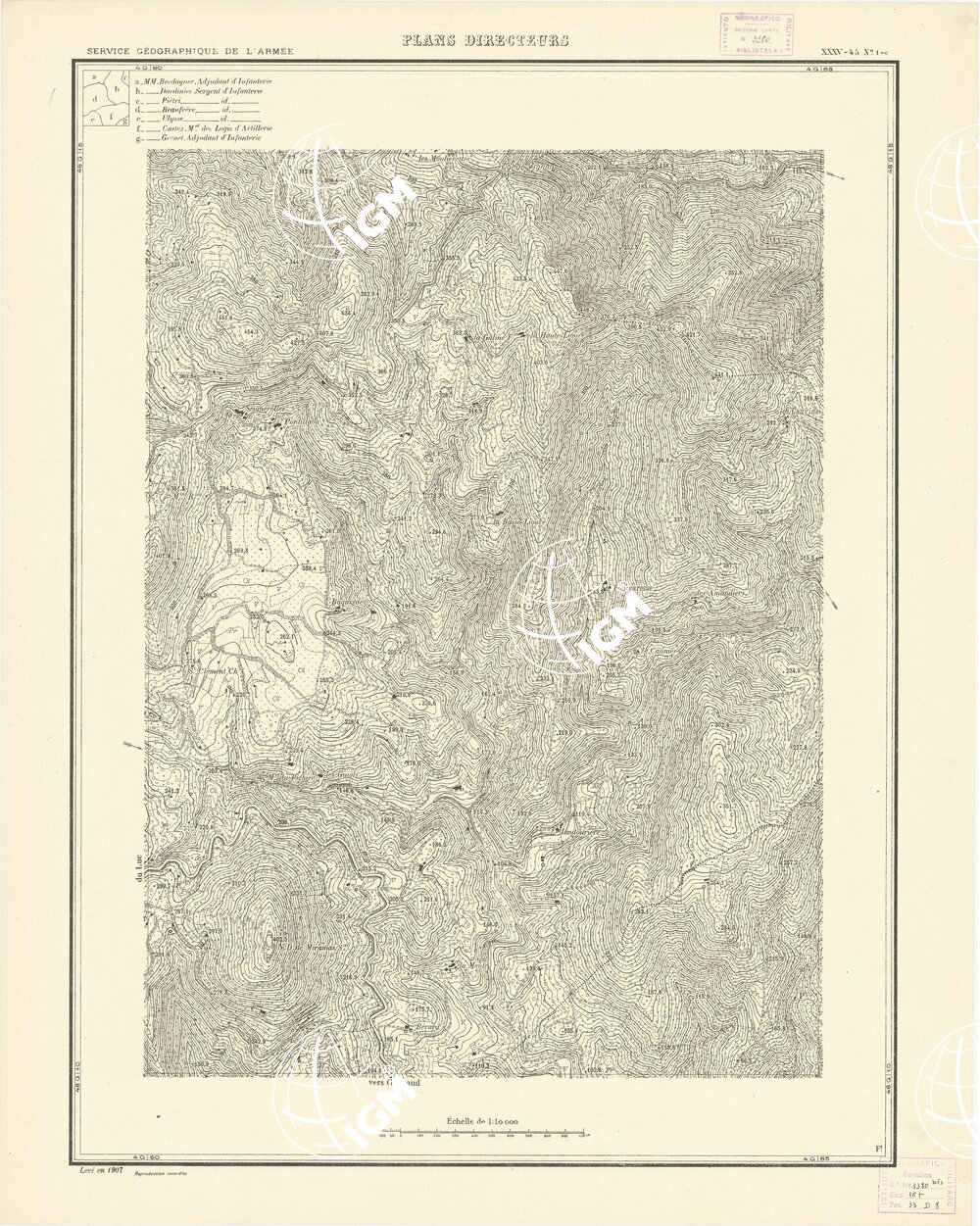 Paris. – Service Géographique de l'Arme 1914-1918. – Questi piani sono stati allestiti durante la guerra mondiale da i "Groupes de Canevas de Tir aux Armées". Su di essi venivano riportate le sistemazioni difensive amiche e nemiche e le varie opere militari. Nelle regioni in cui esistevano le carte alla scala 1:10.000, provenienti da rilievi diretti, queste costituivano la base dei plans directeurs, mentre altrove essi erano dedotti dai piani catastali al 10.000 inquadrati nelle reti dei punti trigonometrici, introducendo per la rappresentazione dell'orografia le linee di livello ricavate dall'ingrandimento dei rilevamenti alla scala 1:40.000. Poichè con tale sistema non si aveva una esatta rappresentazione del terreno, a cura dei "Groupes de Canevas de Tir" fu provveduto, in molte zone, all'esecuzione dei rilievi regolari alla scala 1:10.000. Di tali piani esistono diverse edizioni con formato variabile: una edizione in nero con orografia rappresentata a curve di livello all'equidistanza di m.5 con quadrettatura chilometrica-sistema Lambert; altre edizioni: in nero con curve di livello in bistro, e policrome, sono senza quadrettatura.