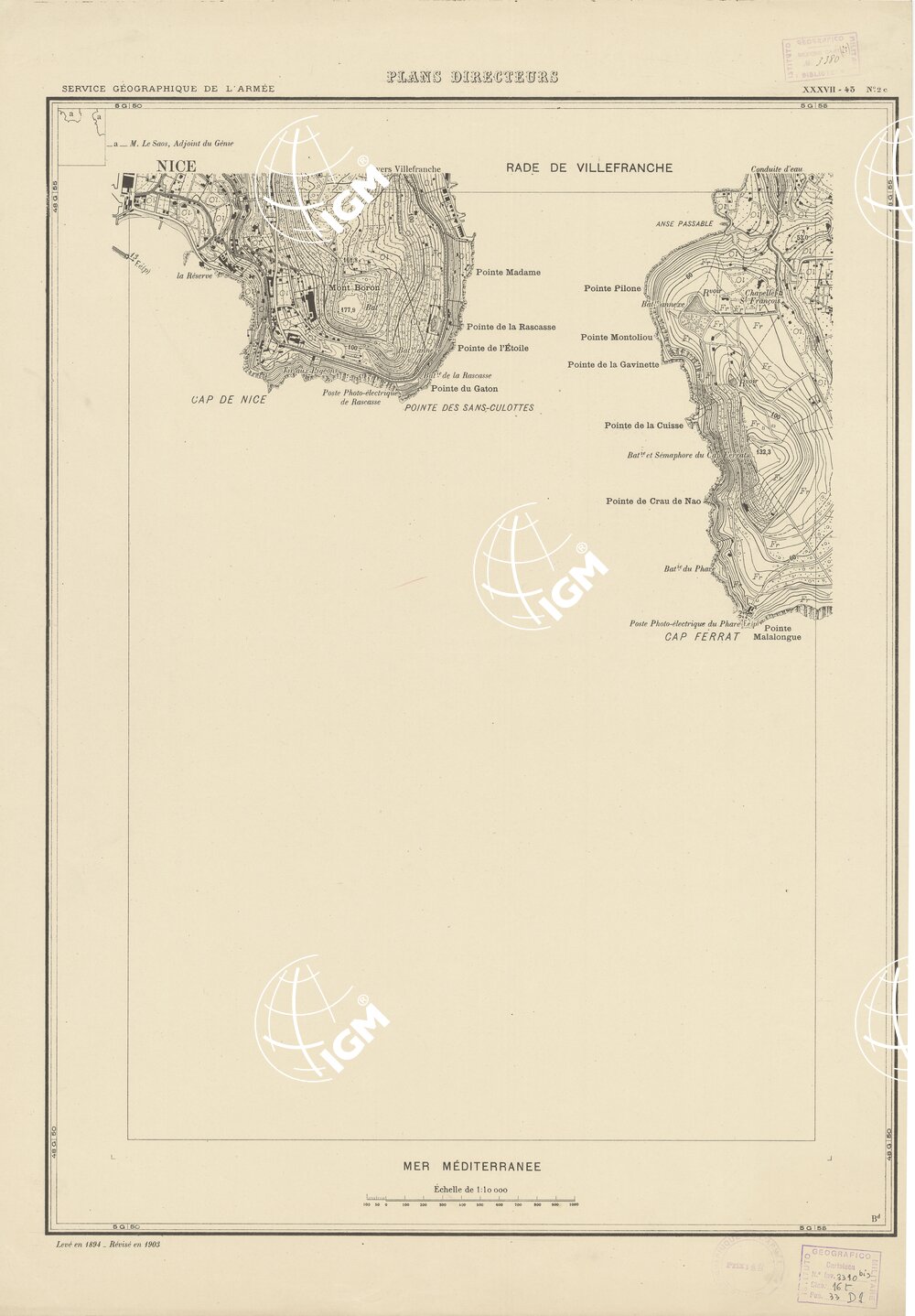 Paris. – Service Géographique de l'Arme 1914-1918. – Questi piani sono stati allestiti durante la guerra mondiale da i "Groupes de Canevas de Tir aux Armées". Su di essi venivano riportate le sistemazioni difensive amiche e nemiche e le varie opere militari. Nelle regioni in cui esistevano le carte alla scala 1:10.000, provenienti da rilievi diretti, queste costituivano la base dei plans directeurs, mentre altrove essi erano dedotti dai piani catastali al 10.000 inquadrati nelle reti dei punti trigonometrici, introducendo per la rappresentazione dell'orografia le linee di livello ricavate dall'ingrandimento dei rilevamenti alla scala 1:40.000. Poichè con tale sistema non si aveva una esatta rappresentazione del terreno, a cura dei "Groupes de Canevas de Tir" fu provveduto, in molte zone, all'esecuzione dei rilievi regolari alla scala 1:10.000. Di tali piani esistono diverse edizioni con formato variabile: una edizione in nero con orografia rappresentata a curve di livello all'equidistanza di m.5 con quadrettatura chilometrica-sistema Lambert; altre edizioni: in nero con curve di livello in bistro, e policrome, sono senza quadrettatura.