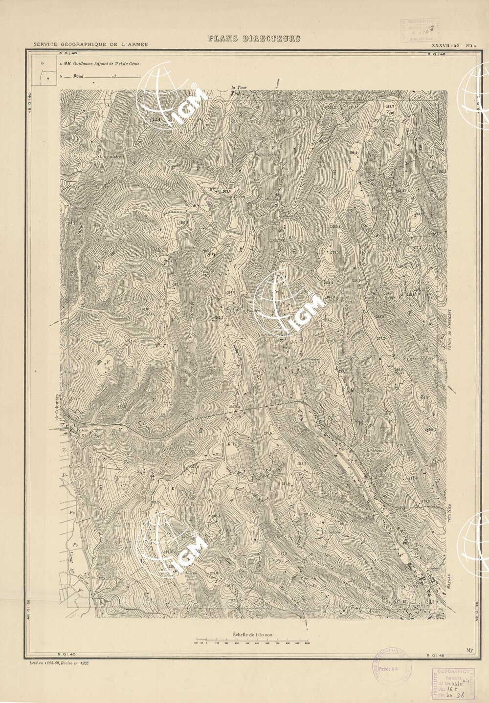 Paris. – Service Géographique de l'Arme 1914-1918. – Questi piani sono stati allestiti durante la guerra mondiale da i "Groupes de Canevas de Tir aux Armées". Su di essi venivano riportate le sistemazioni difensive amiche e nemiche e le varie opere militari. Nelle regioni in cui esistevano le carte alla scala 1:10.000, provenienti da rilievi diretti, queste costituivano la base dei plans directeurs, mentre altrove essi erano dedotti dai piani catastali al 10.000 inquadrati nelle reti dei punti trigonometrici, introducendo per la rappresentazione dell'orografia le linee di livello ricavate dall'ingrandimento dei rilevamenti alla scala 1:40.000. Poichè con tale sistema non si aveva una esatta rappresentazione del terreno, a cura dei "Groupes de Canevas de Tir" fu provveduto, in molte zone, all'esecuzione dei rilievi regolari alla scala 1:10.000. Di tali piani esistono diverse edizioni con formato variabile: una edizione in nero con orografia rappresentata a curve di livello all'equidistanza di m.5 con quadrettatura chilometrica-sistema Lambert; altre edizioni: in nero con curve di livello in bistro, e policrome, sono senza quadrettatura.