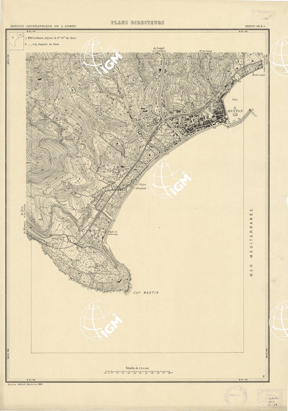 Paris. – Service Géographique de l'Arme 1914-1918. – Questi piani sono stati allestiti durante la guerra mondiale da i "Groupes de Canevas de Tir aux Armées". Su di essi venivano riportate le sistemazioni difensive amiche e nemiche e le varie opere militari. Nelle regioni in cui esistevano le carte alla scala 1:10.000, provenienti da rilievi diretti, queste costituivano la base dei plans directeurs, mentre altrove essi erano dedotti dai piani catastali al 10.000 inquadrati nelle reti dei punti trigonometrici, introducendo per la rappresentazione dell'orografia le linee di livello ricavate dall'ingrandimento dei rilevamenti alla scala 1:40.000. Poichè con tale sistema non si aveva una esatta rappresentazione del terreno, a cura dei "Groupes de Canevas de Tir" fu provveduto, in molte zone, all'esecuzione dei rilievi regolari alla scala 1:10.000. Di tali piani esistono diverse edizioni con formato variabile: una edizione in nero con orografia rappresentata a curve di livello all'equidistanza di m.5 con quadrettatura chilometrica-sistema Lambert; altre edizioni: in nero con curve di livello in bistro, e policrome, sono senza quadrettatura.