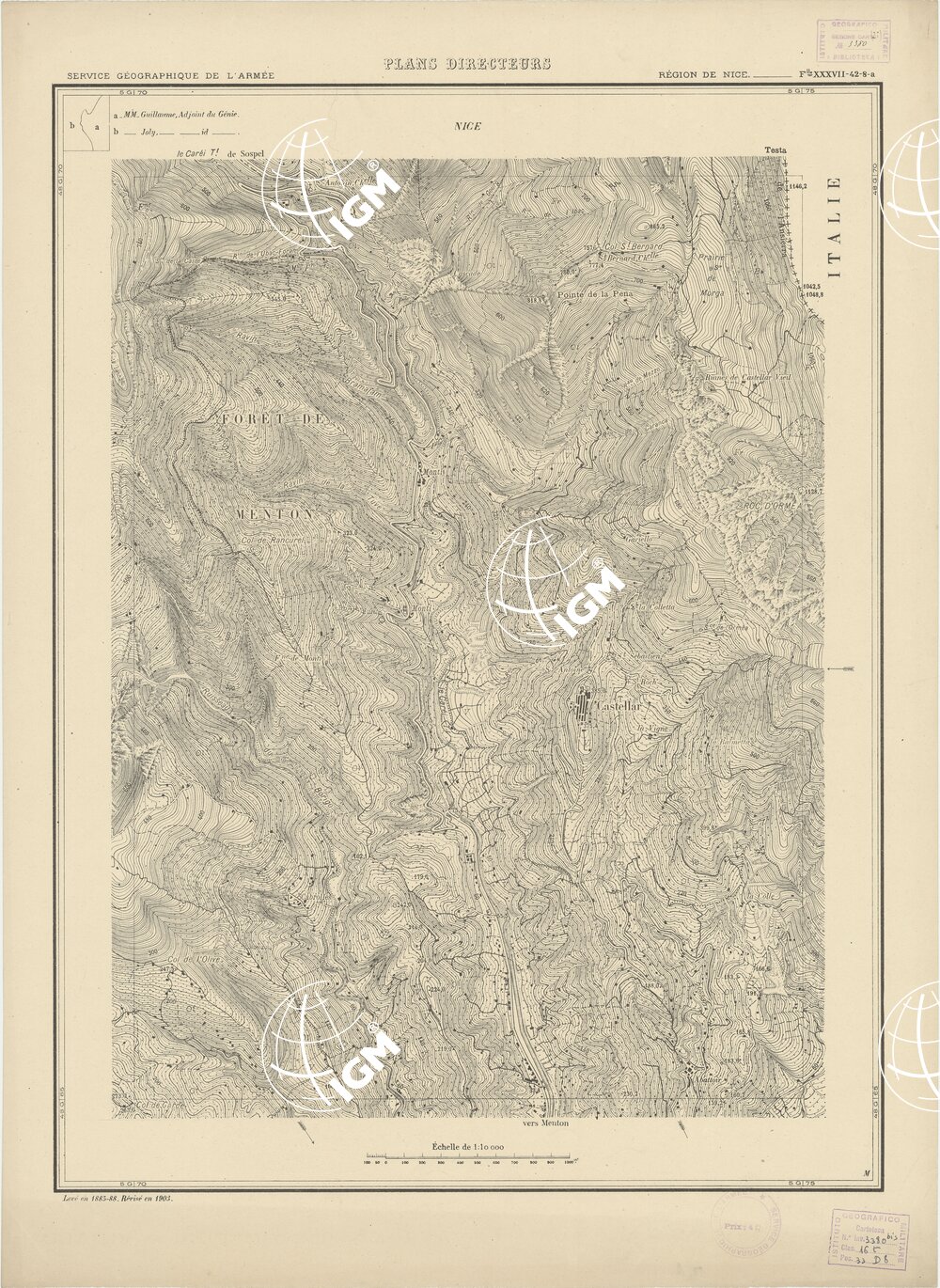 Paris. – Service Géographique de l'Arme 1914-1918. – Questi piani sono stati allestiti durante la guerra mondiale da i "Groupes de Canevas de Tir aux Armées". Su di essi venivano riportate le sistemazioni difensive amiche e nemiche e le varie opere militari. Nelle regioni in cui esistevano le carte alla scala 1:10.000, provenienti da rilievi diretti, queste costituivano la base dei plans directeurs, mentre altrove essi erano dedotti dai piani catastali al 10.000 inquadrati nelle reti dei punti trigonometrici, introducendo per la rappresentazione dell'orografia le linee di livello ricavate dall'ingrandimento dei rilevamenti alla scala 1:40.000. Poichè con tale sistema non si aveva una esatta rappresentazione del terreno, a cura dei "Groupes de Canevas de Tir" fu provveduto, in molte zone, all'esecuzione dei rilievi regolari alla scala 1:10.000. Di tali piani esistono diverse edizioni con formato variabile: una edizione in nero con orografia rappresentata a curve di livello all'equidistanza di m.5 con quadrettatura chilometrica-sistema Lambert; altre edizioni: in nero con curve di livello in bistro, e policrome, sono senza quadrettatura.