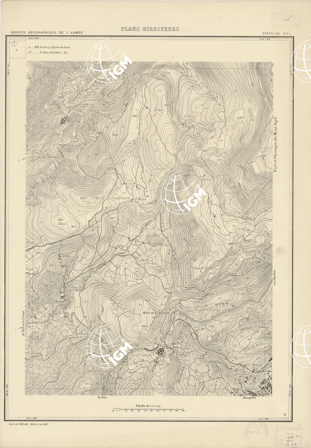 Paris. – Service Géographique de l'Arme 1914-1918. – Questi piani sono stati allestiti durante la guerra mondiale da i "Groupes de Canevas de Tir aux Armées". Su di essi venivano riportate le sistemazioni difensive amiche e nemiche e le varie opere militari. Nelle regioni in cui esistevano le carte alla scala 1:10.000, provenienti da rilievi diretti, queste costituivano la base dei plans directeurs, mentre altrove essi erano dedotti dai piani catastali al 10.000 inquadrati nelle reti dei punti trigonometrici, introducendo per la rappresentazione dell'orografia le linee di livello ricavate dall'ingrandimento dei rilevamenti alla scala 1:40.000. Poichè con tale sistema non si aveva una esatta rappresentazione del terreno, a cura dei "Groupes de Canevas de Tir" fu provveduto, in molte zone, all'esecuzione dei rilievi regolari alla scala 1:10.000. Di tali piani esistono diverse edizioni con formato variabile: una edizione in nero con orografia rappresentata a curve di livello all'equidistanza di m.5 con quadrettatura chilometrica-sistema Lambert; altre edizioni: in nero con curve di livello in bistro, e policrome, sono senza quadrettatura.