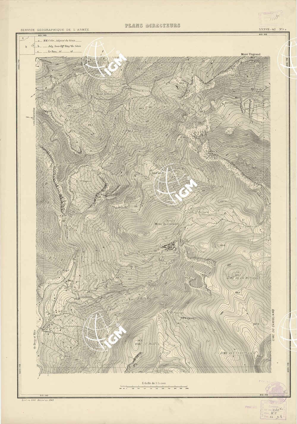 Paris. – Service Géographique de l'Arme 1914-1918. – Questi piani sono stati allestiti durante la guerra mondiale da i "Groupes de Canevas de Tir aux Armées". Su di essi venivano riportate le sistemazioni difensive amiche e nemiche e le varie opere militari. Nelle regioni in cui esistevano le carte alla scala 1:10.000, provenienti da rilievi diretti, queste costituivano la base dei plans directeurs, mentre altrove essi erano dedotti dai piani catastali al 10.000 inquadrati nelle reti dei punti trigonometrici, introducendo per la rappresentazione dell'orografia le linee di livello ricavate dall'ingrandimento dei rilevamenti alla scala 1:40.000. Poichè con tale sistema non si aveva una esatta rappresentazione del terreno, a cura dei "Groupes de Canevas de Tir" fu provveduto, in molte zone, all'esecuzione dei rilievi regolari alla scala 1:10.000. Di tali piani esistono diverse edizioni con formato variabile: una edizione in nero con orografia rappresentata a curve di livello all'equidistanza di m.5 con quadrettatura chilometrica-sistema Lambert; altre edizioni: in nero con curve di livello in bistro, e policrome, sono senza quadrettatura.