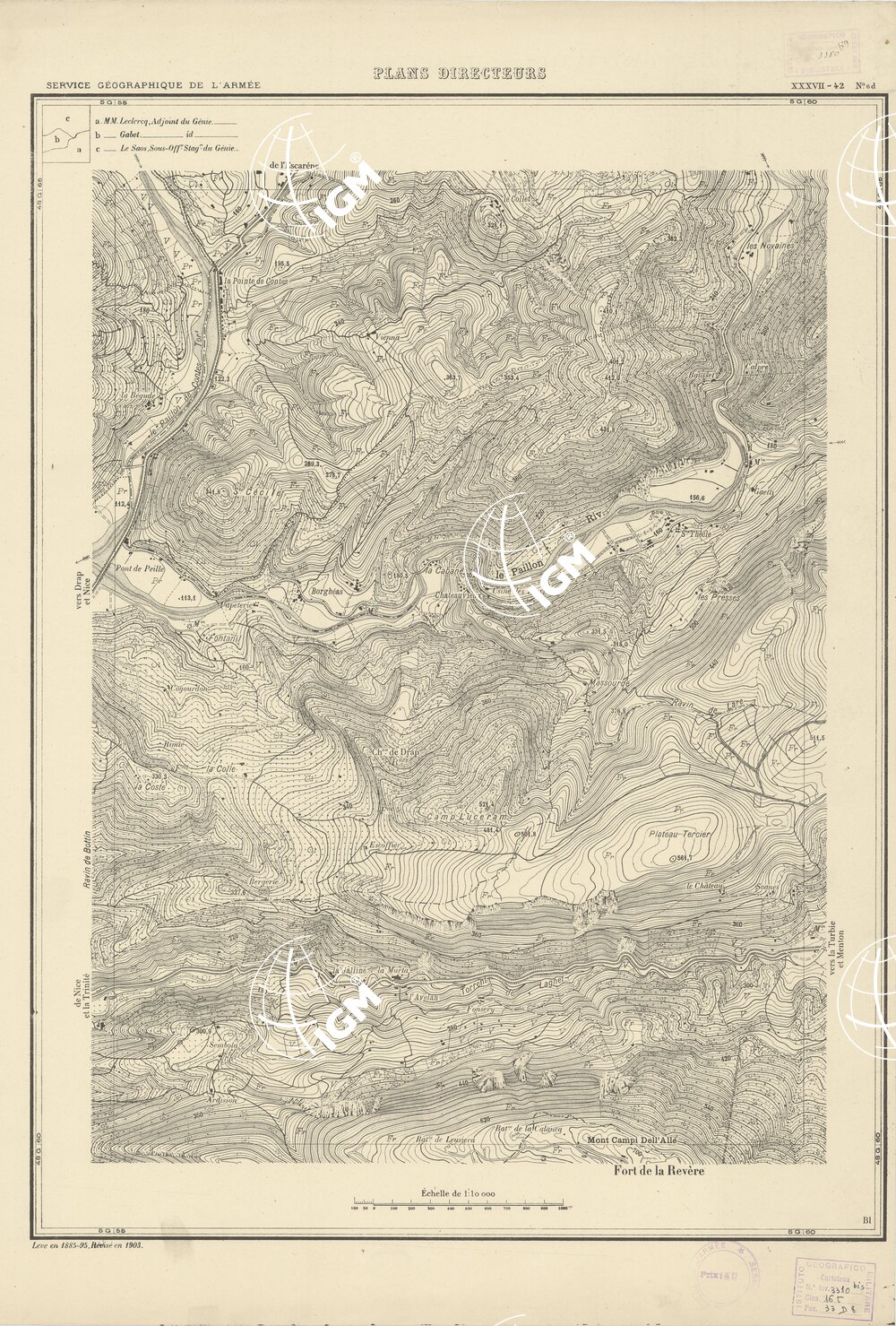 Paris. – Service Géographique de l'Arme 1914-1918. – Questi piani sono stati allestiti durante la guerra mondiale da i "Groupes de Canevas de Tir aux Armées". Su di essi venivano riportate le sistemazioni difensive amiche e nemiche e le varie opere militari. Nelle regioni in cui esistevano le carte alla scala 1:10.000, provenienti da rilievi diretti, queste costituivano la base dei plans directeurs, mentre altrove essi erano dedotti dai piani catastali al 10.000 inquadrati nelle reti dei punti trigonometrici, introducendo per la rappresentazione dell'orografia le linee di livello ricavate dall'ingrandimento dei rilevamenti alla scala 1:40.000. Poichè con tale sistema non si aveva una esatta rappresentazione del terreno, a cura dei "Groupes de Canevas de Tir" fu provveduto, in molte zone, all'esecuzione dei rilievi regolari alla scala 1:10.000. Di tali piani esistono diverse edizioni con formato variabile: una edizione in nero con orografia rappresentata a curve di livello all'equidistanza di m.5 con quadrettatura chilometrica-sistema Lambert; altre edizioni: in nero con curve di livello in bistro, e policrome, sono senza quadrettatura.