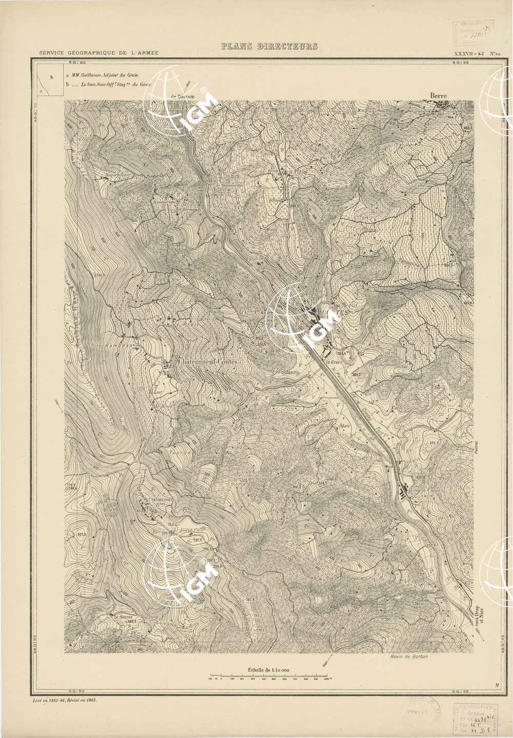 Paris. – Service Géographique de l'Arme 1914-1918. – Questi piani sono stati allestiti durante la guerra mondiale da i "Groupes de Canevas de Tir aux Armées". Su di essi venivano riportate le sistemazioni difensive amiche e nemiche e le varie opere militari. Nelle regioni in cui esistevano le carte alla scala 1:10.000, provenienti da rilievi diretti, queste costituivano la base dei plans directeurs, mentre altrove essi erano dedotti dai piani catastali al 10.000 inquadrati nelle reti dei punti trigonometrici, introducendo per la rappresentazione dell'orografia le linee di livello ricavate dall'ingrandimento dei rilevamenti alla scala 1:40.000. Poichè con tale sistema non si aveva una esatta rappresentazione del terreno, a cura dei "Groupes de Canevas de Tir" fu provveduto, in molte zone, all'esecuzione dei rilievi regolari alla scala 1:10.000. Di tali piani esistono diverse edizioni con formato variabile: una edizione in nero con orografia rappresentata a curve di livello all'equidistanza di m.5 con quadrettatura chilometrica-sistema Lambert; altre edizioni: in nero con curve di livello in bistro, e policrome, sono senza quadrettatura.